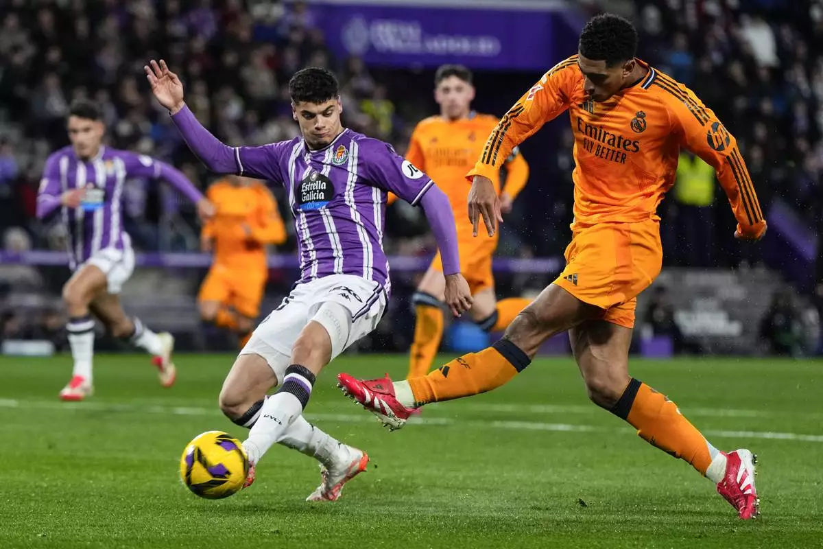 Real Madrid's Jude Bellingham, right, tries a shot during the Spanish La Liga soccer match between Valladolid and Real Madrid at the Jose Zorrilla stadium in Valladolid, Spain, Saturday, Jan. 25, 2025. (AP Photo/Manu Fernandez)
