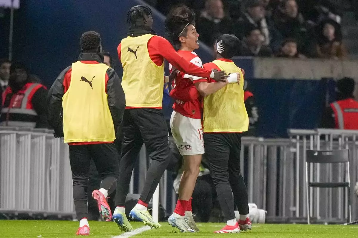 Reims' Keito Nakamura, celebrates with teammates after scoring his side's first goal during the French League One soccer match between Paris Saint-Germain and Reims at Parc des Princes stadium in Paris, Saturday, Jan. 25, 2025. (AP Photo/Michel Euler)