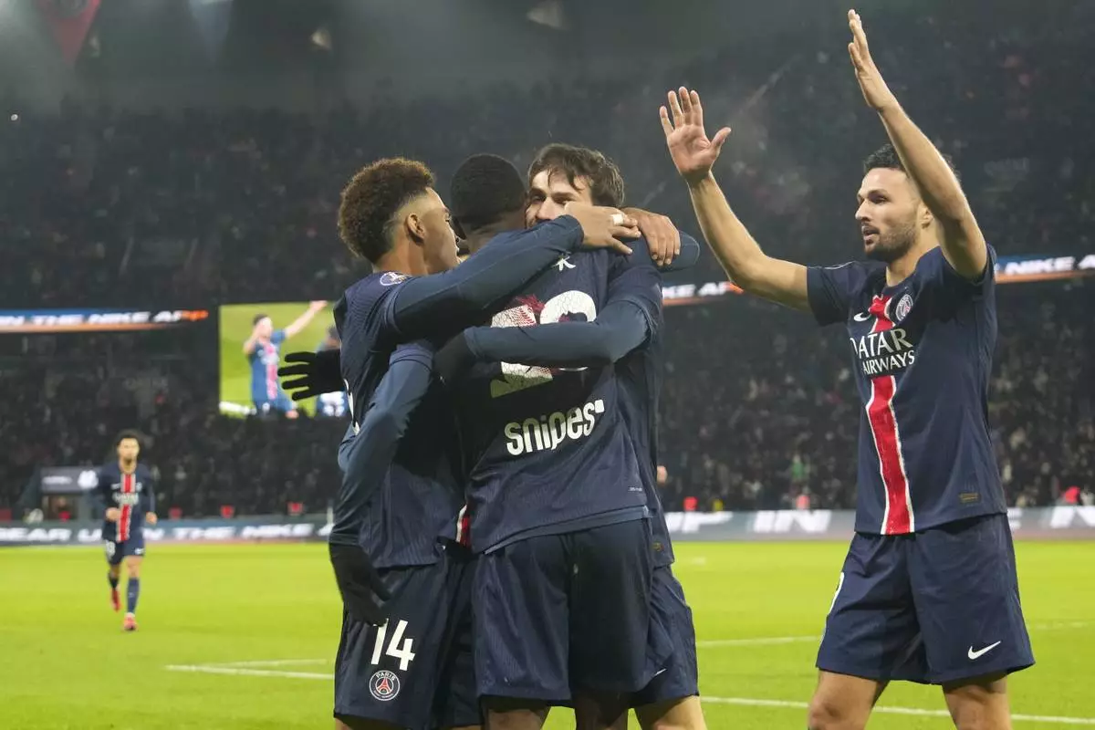 PSG's Ousmane Dembele, center, celebrates with teammates after scoring the opening goal during the French League One soccer match between Paris Saint-Germain and Reims at Parc des Princes stadium in Paris, Saturday, Jan. 25, 2025. (AP Photo/Michel Euler)