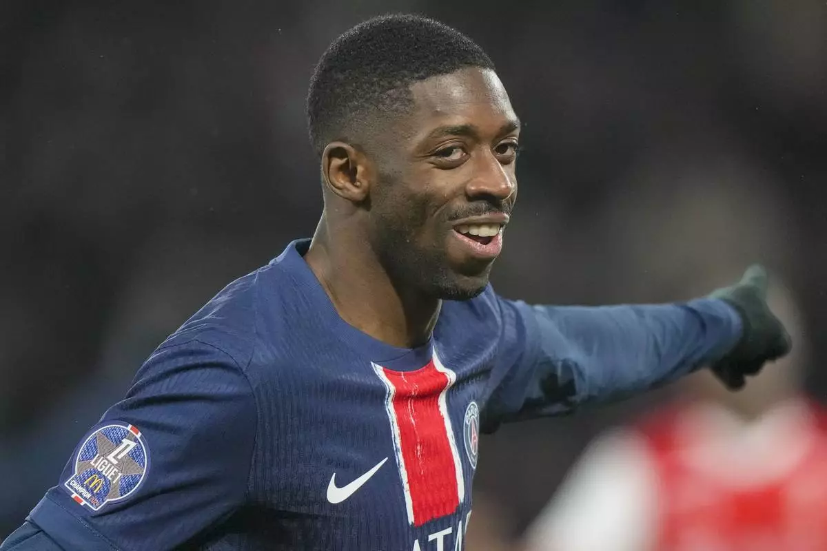 PSG's Ousmane Dembele celebrates after scoring the opening goal during the French League One soccer match between Paris Saint-Germain and Reims at Parc des Princes stadium in Paris, Saturday, Jan. 25, 2025. (AP Photo/Michel Euler)
