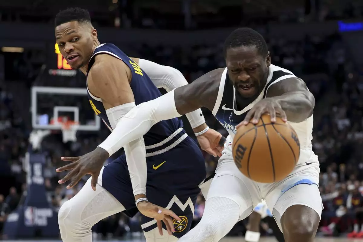 Minnesota Timberwolves forward Julius Randle, right, vies for a loose ball while Denver Nuggets guard Russell Westbrook defends during the first half of an NBA basketball game, Saturday, Jan. 25, 2025, in Minneapolis. (AP Photo/Ellen Schmidt)