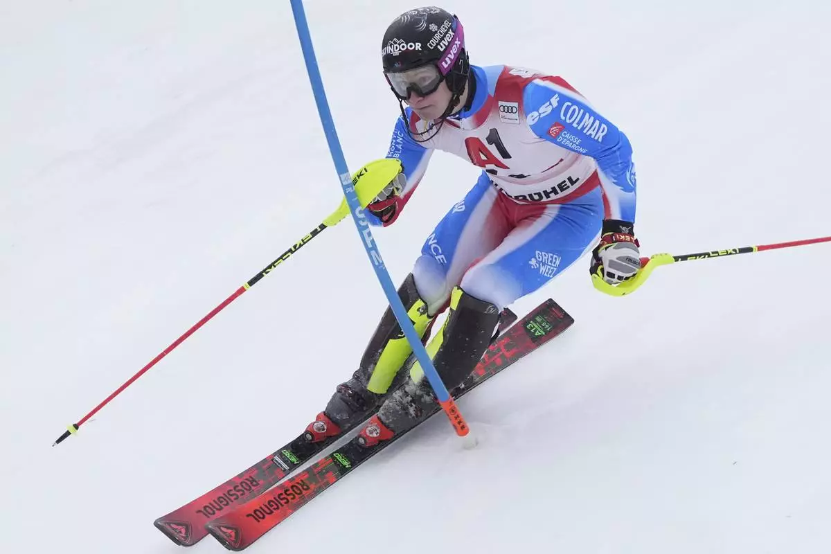 France's Steven Amiez speeds down the course during an alpine ski, men's World Cup slalom in Kitzbühel, Austria, Sunday, Jan. 26, 2025. (AP Photo/Giovanni Auletta)