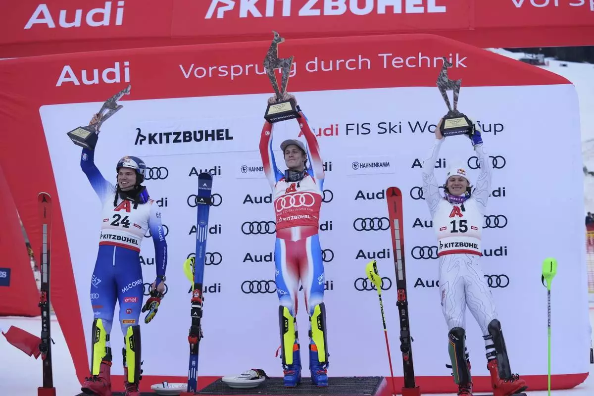 From left, second placed Italy's Alex Vinatzer, the winner France's Clement Noel and third placed Brazil' Lucas Braathen celebrate after an alpine ski, men's World Cup slalom in Kitzbühel, Austria, Sunday, Jan. 26, 2025. (AP Photo/Giovanni Auletta)