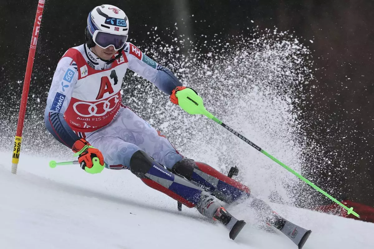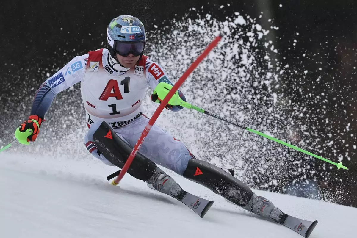 Norway's Henrik Kristoffersen speeds down the course during an alpine ski, men's World Cup slalom, in Kitzbühel, Austria, Sunday, Jan. 26, 2025. (AP Photo/Marco Trovati)