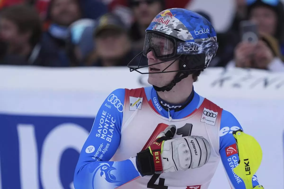 France's Clement Noel reacts after completing an alpine ski, men's World Cup slalom in Kitzbühel, Austria, Sunday, Jan. 26, 2025. (AP Photo/Giovanni Auletta)