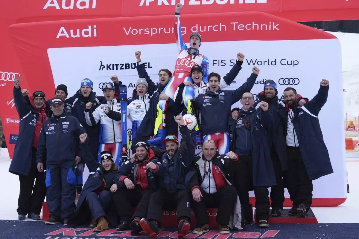 The winner France's Clement Noel celebrates with the team after an alpine ski, men's World Cup slalom in Kitzbühel, Austria, Sunday, Jan. 26, 2025. (AP Photo/Giovanni Auletta)