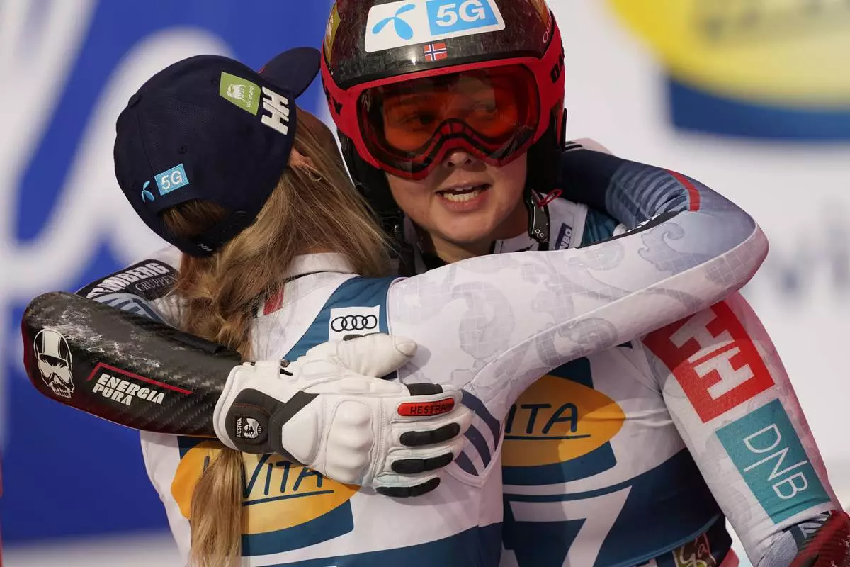 Norway's Kajsa Vickhoff Lie and Marte Monsen embrace after completing an alpine ski, women's World Cup super G, in Garmisch, Germany, Sunday, Jan. 26, 2025. (AP Photo/Piermarco Tacca)