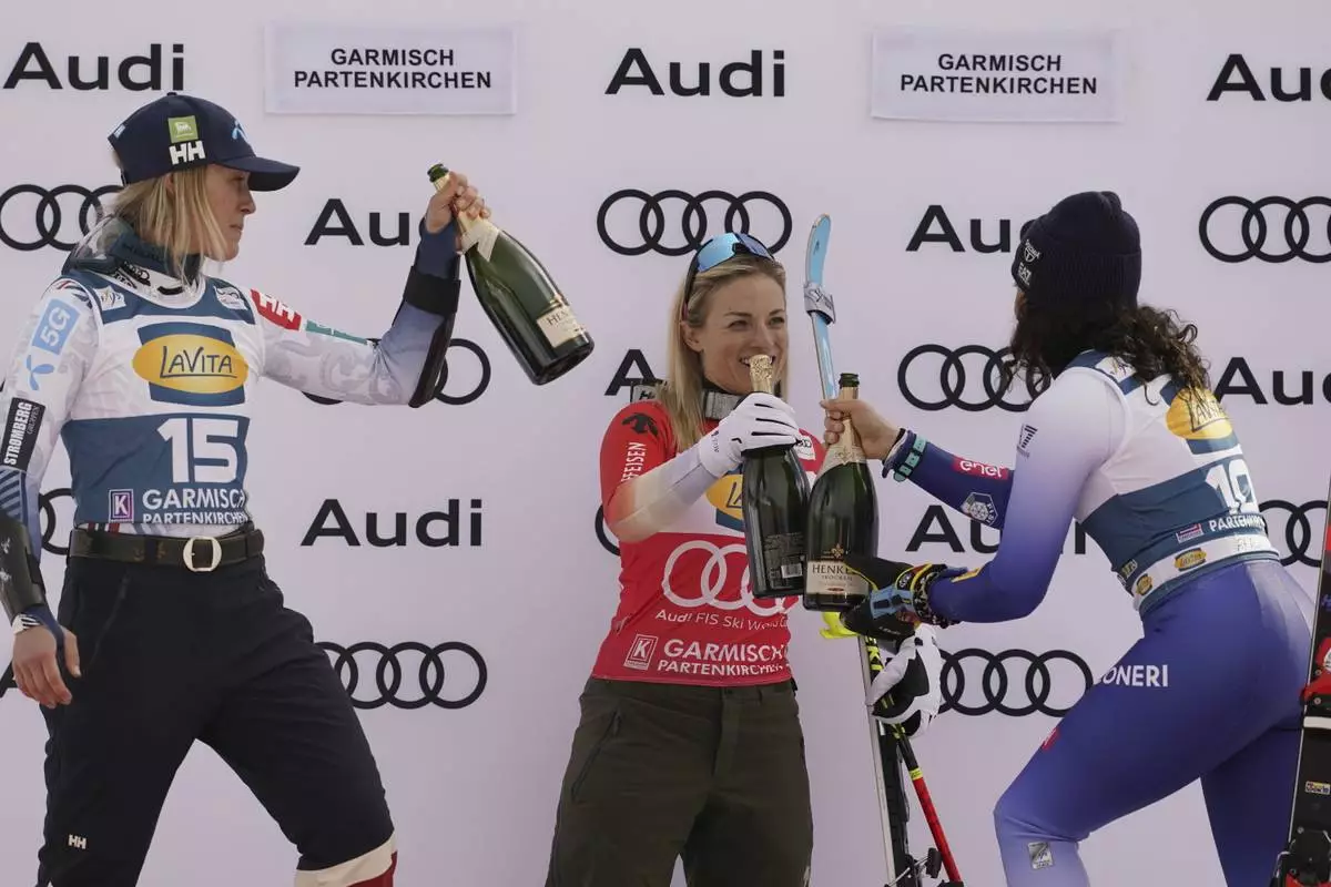 From left, second placed Norway's Kajsa Vickhoff Lie, the winner Switzerland's Lara Gut Behrami and third placed Italy's Federica Brignone celebrate after an alpine ski, women's World Cup super G, in Garmisch, Germany, Sunday, Jan. 26, 2025. (AP Photo/Piermarco Tacca)