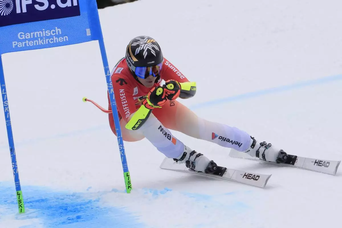 Switzerland's Lara Gut Behrami speeds down the course during an alpine ski, women's World Cup super G, in Garmisch, Germany, Sunday, Jan. 26, 2025. (AP Photo/Giovanni Maria Pizzato)