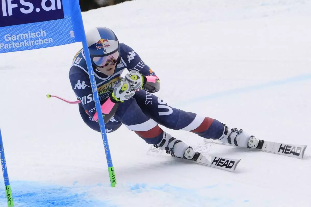 United States' Lindsey Vonn speeds down the course during an alpine ski, women's World Cup super G, in Garmisch, Germany, Sunday, Jan. 26, 2025. (AP Photo/Giovanni Maria Pizzato)