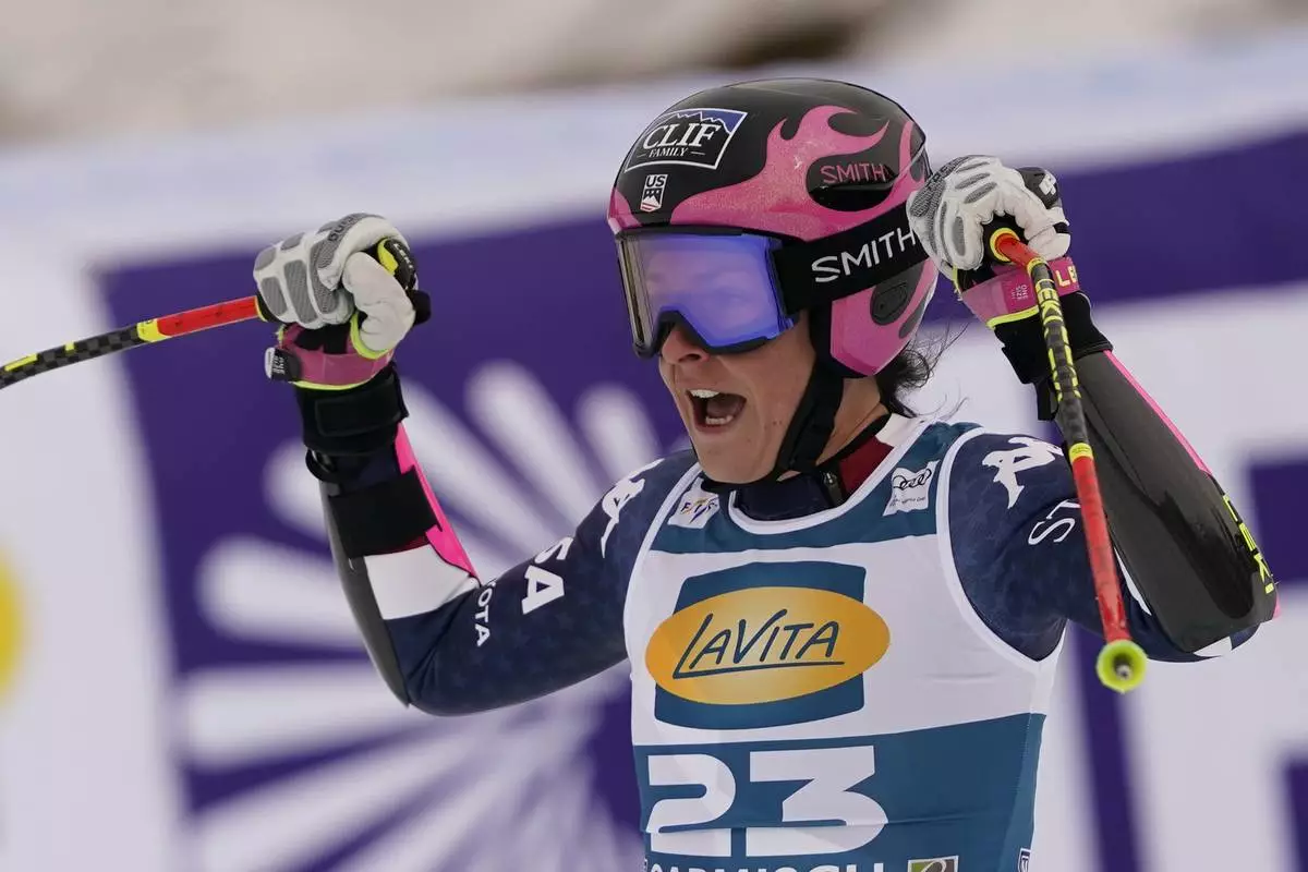 United States' Keely Cashman reacts after completing an alpine ski, women's World Cup super G, in Garmisch, Germany, Sunday, Jan. 26, 2025. (AP Photo/Piermarco Tacca)