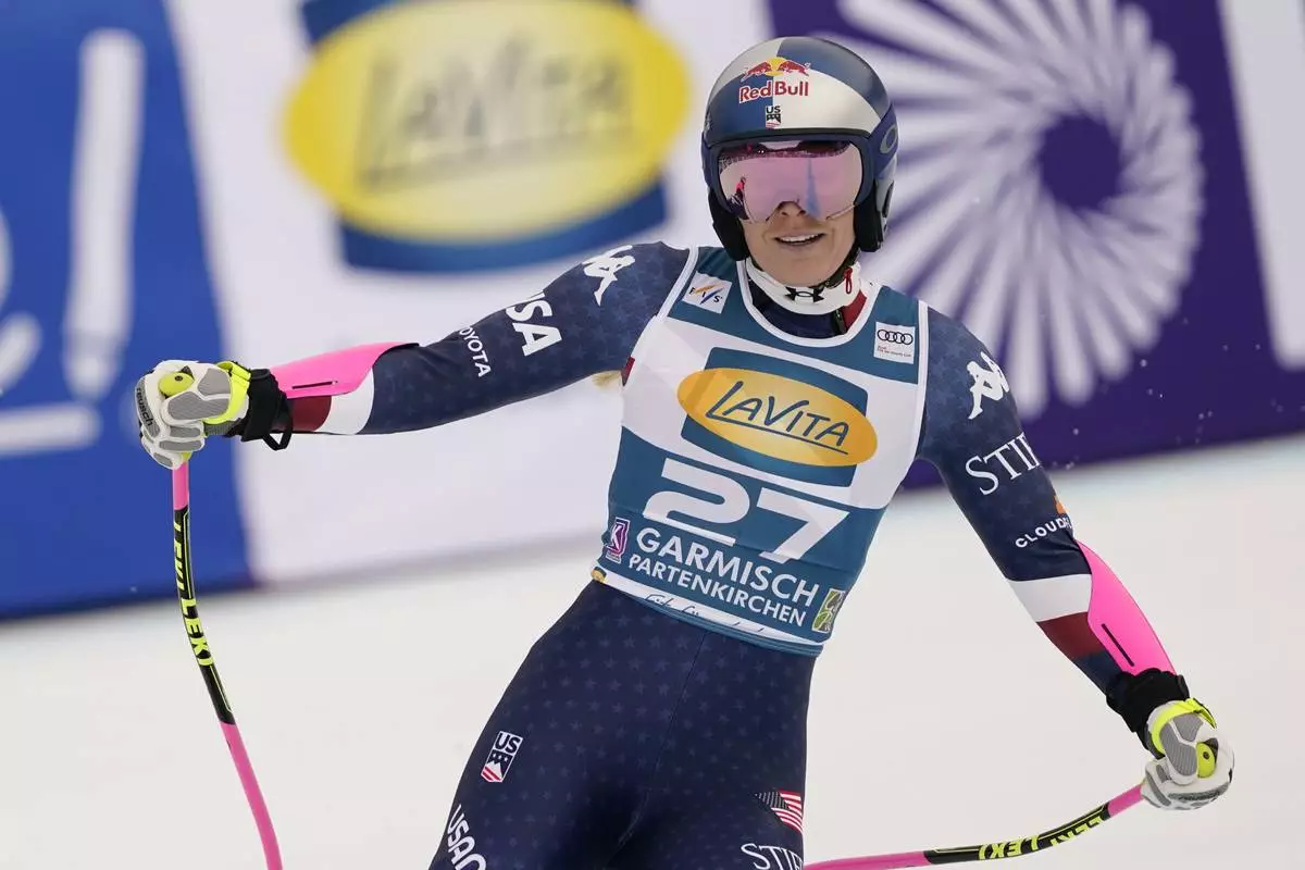 United States' Lindsey Vonn reacts after completing an alpine ski, women's World Cup super G, in Garmisch, Germany, Sunday, Jan. 26, 2025. (AP Photo/Piermarco Tacca)