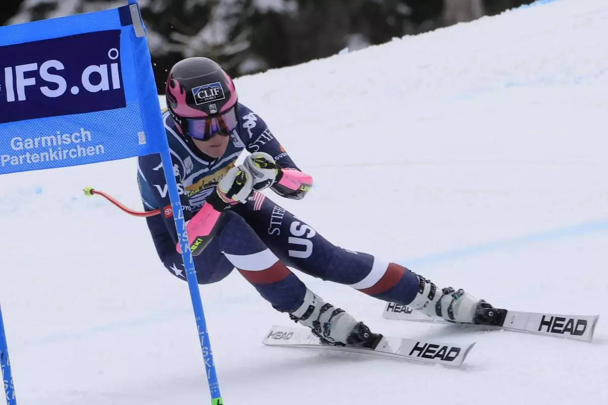 United States' Keely Cashman speeds down the course during an alpine ski, women's World Cup super G, in Garmisch, Germany, Sunday, Jan. 26, 2025. (AP Photo/Giovanni Maria Pizzato)