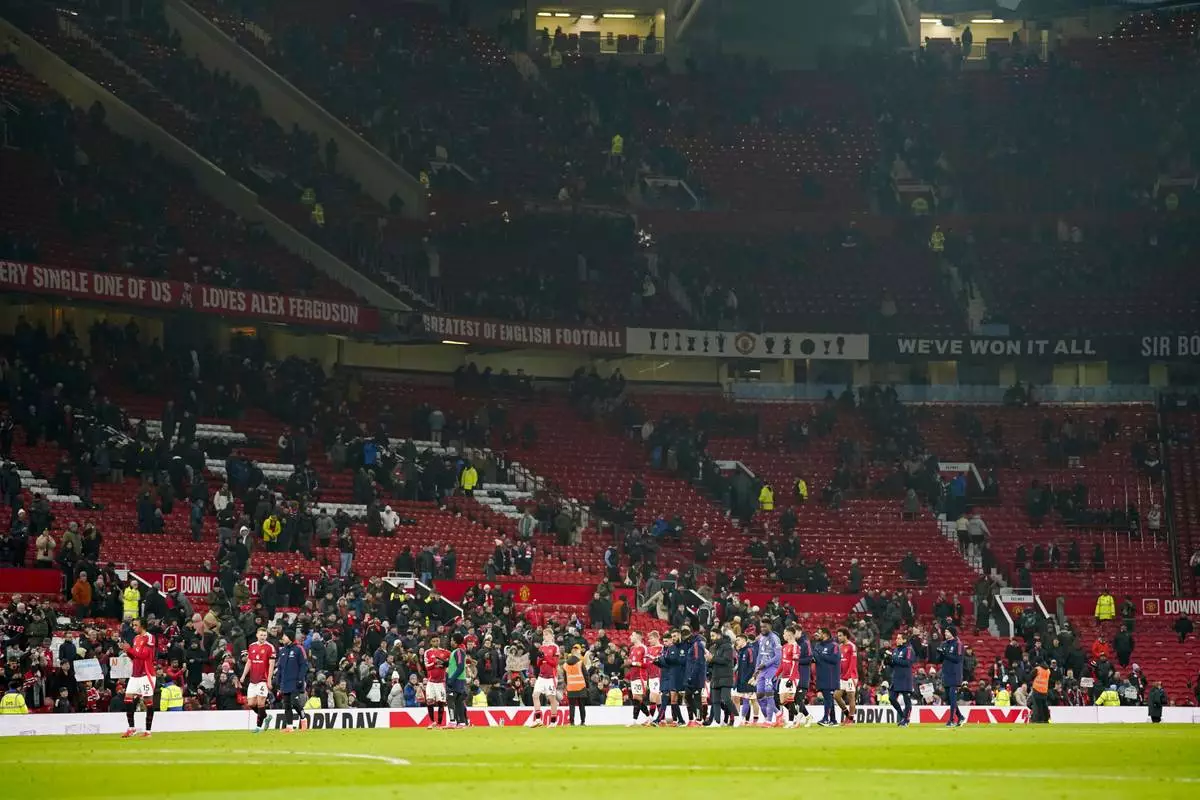 Manchester United players do a lap of honor in from of empty stands as their supporters leave them at the end of the English Premier League soccer match between Manchester United and Brighton and Hove Albion, at the Old Trafford stadium in Manchester, England, Sunday, Jan. 19, 2025. (AP Photo/Dave Thompson)