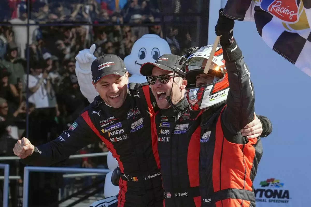 Porsche Penske Motorsport team drivers, from left to right, Brazil's Felipe Nasr, Belgium's Laurens Vanthoor and Britain's Nick Tandy celebrate in Victory Lane after winning the IMSA Rolex 24 hour auto race at Daytona International Speedway, Sunday, Jan. 26, 2025, in Daytona Beach, Fla. (AP Photo/John Raoux)