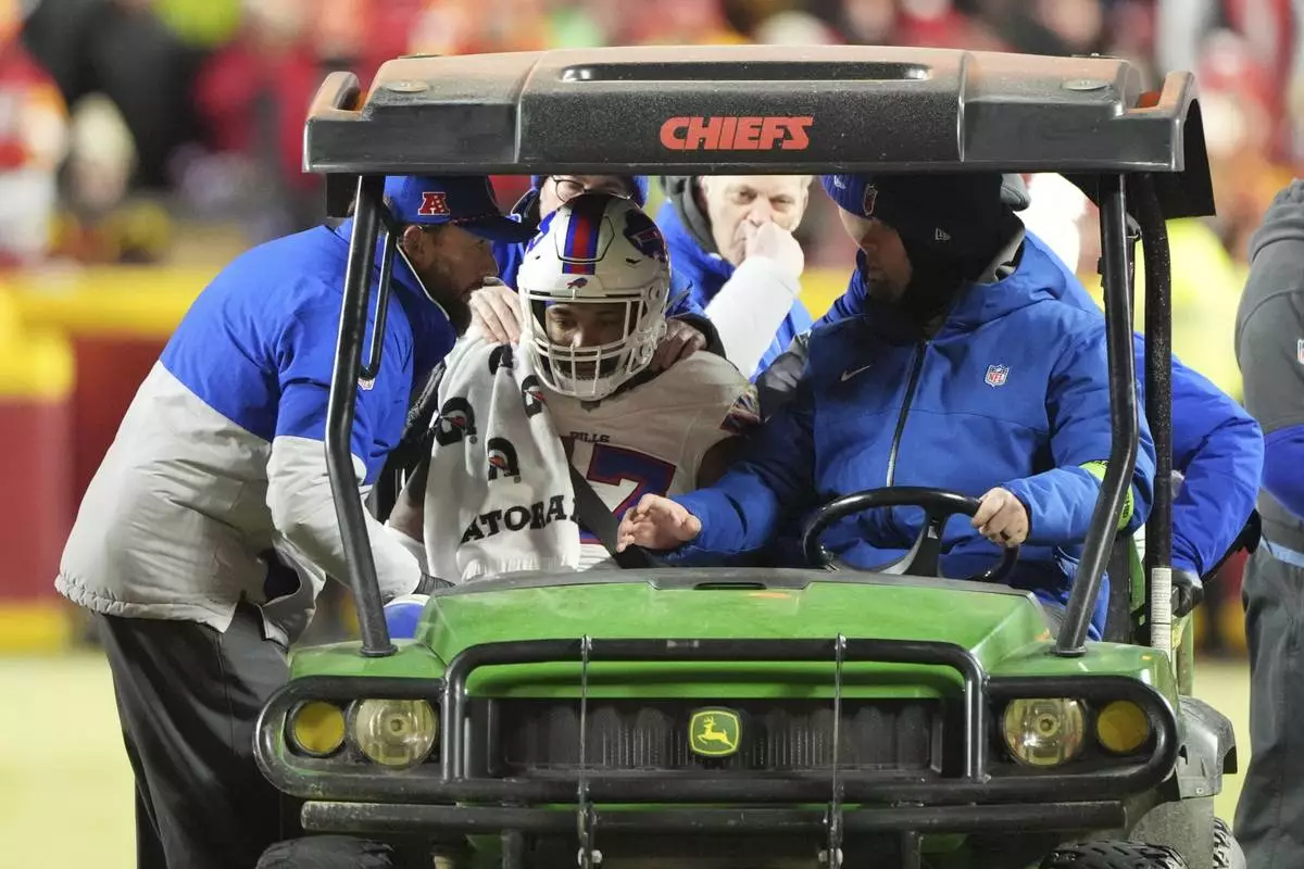 Buffalo Bills cornerback Christian Benford is assisted after being injured during the first half of the AFC Championship NFL football game against the Kansas City Chiefs, Sunday, Jan. 26, 2025, in Kansas City, Mo. (AP Photo/Charlie Riedel)
