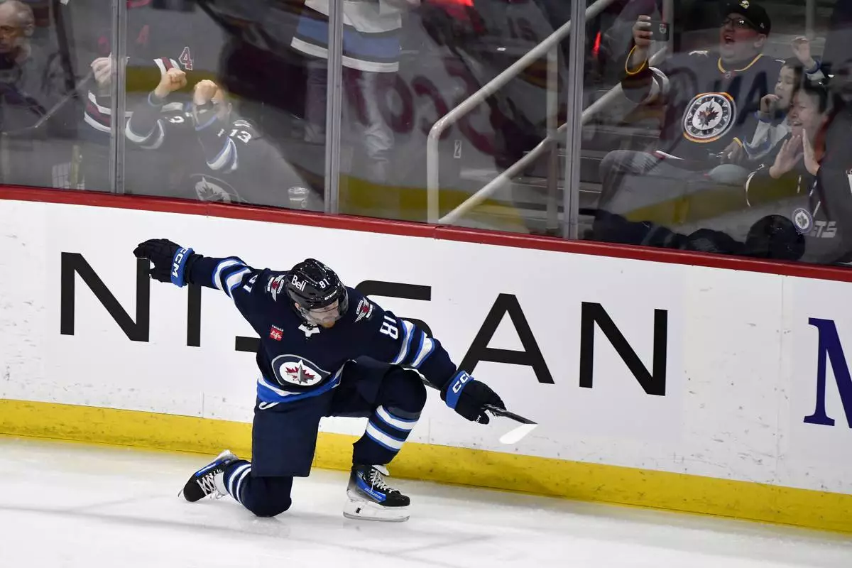 Winnipeg Jets' Kyle Connor (81) celebrates his goal against the Calgary Flames during the first period of an NHL hockey game in Winnipeg, Manitoba, Sunday, Jan. 26, 2025. (Fred Greenslade/The Canadian Press via AP)