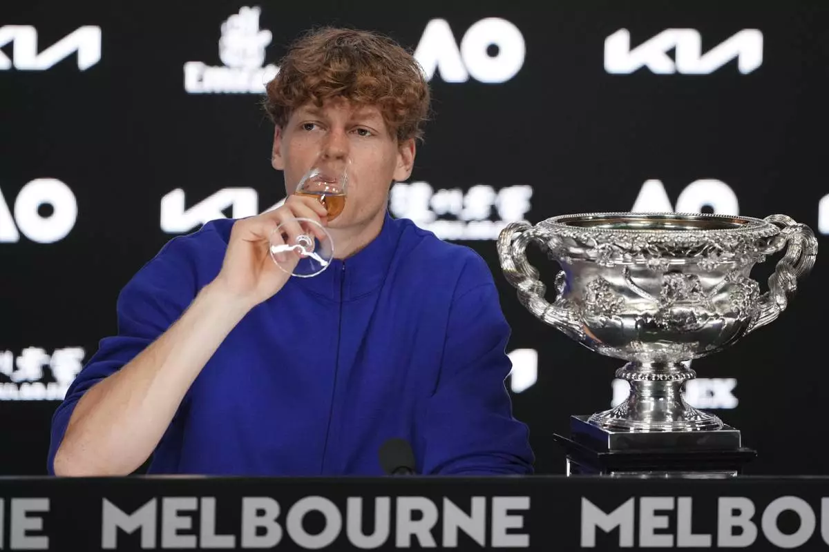 Jannik Sinner of Italy drinks a glass champagne during a press conference after defeating Alexander Zverev of Germany in the men's singles final at the Australian Open tennis championship in Melbourne, Australia, Monday, Jan. 27, 2025. (AP Photo/Manish Swarup)