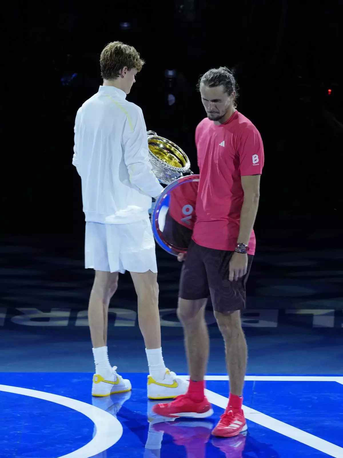 Alexander Zverev of Germany, right, turns to leave the stage after he congratulated Jannik Sinner of Italy following the men's singles final at the Australian Open tennis championship in Melbourne, Australia, Sunday, Jan. 26, 2025. (AP Photo/Vincent Thian)