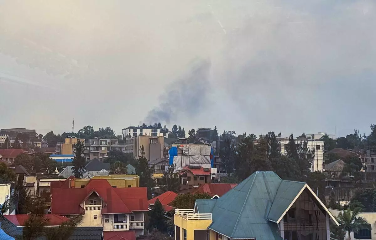 Smoke rises over Goma, Democratic Republic of the Congo, Monday, Jan. 27, 2025, as M23 rebels make their way to the center of the town. (AP Photo/Moses Sawasawa)