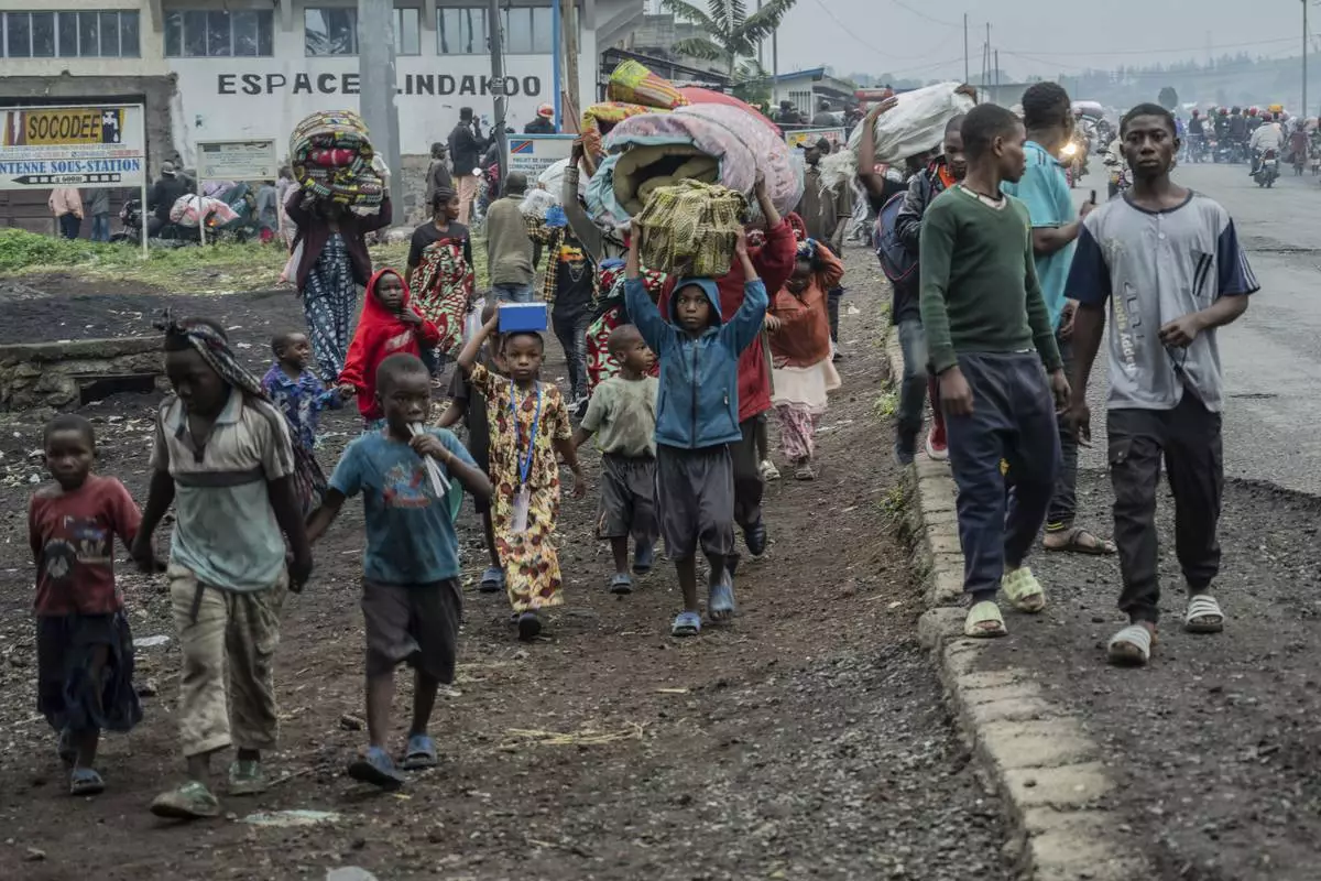People displaced by the fighting with M23 rebels make their way to the center of Goma, Democratic Republic of the Congo, Sunday, Jan. 26, 2025. (AP Photo/Moses Sawasawa)