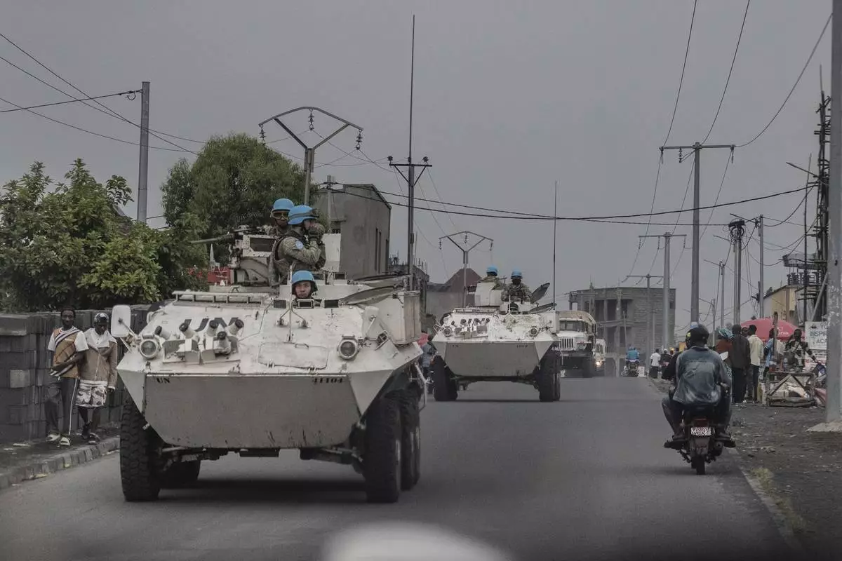 UN armoured personnel carriers deploy outside Goma, Democratic Republic of the Congo, Saturday, Jan. 25, 2025. (AP Photo/Moses Sawasawa)