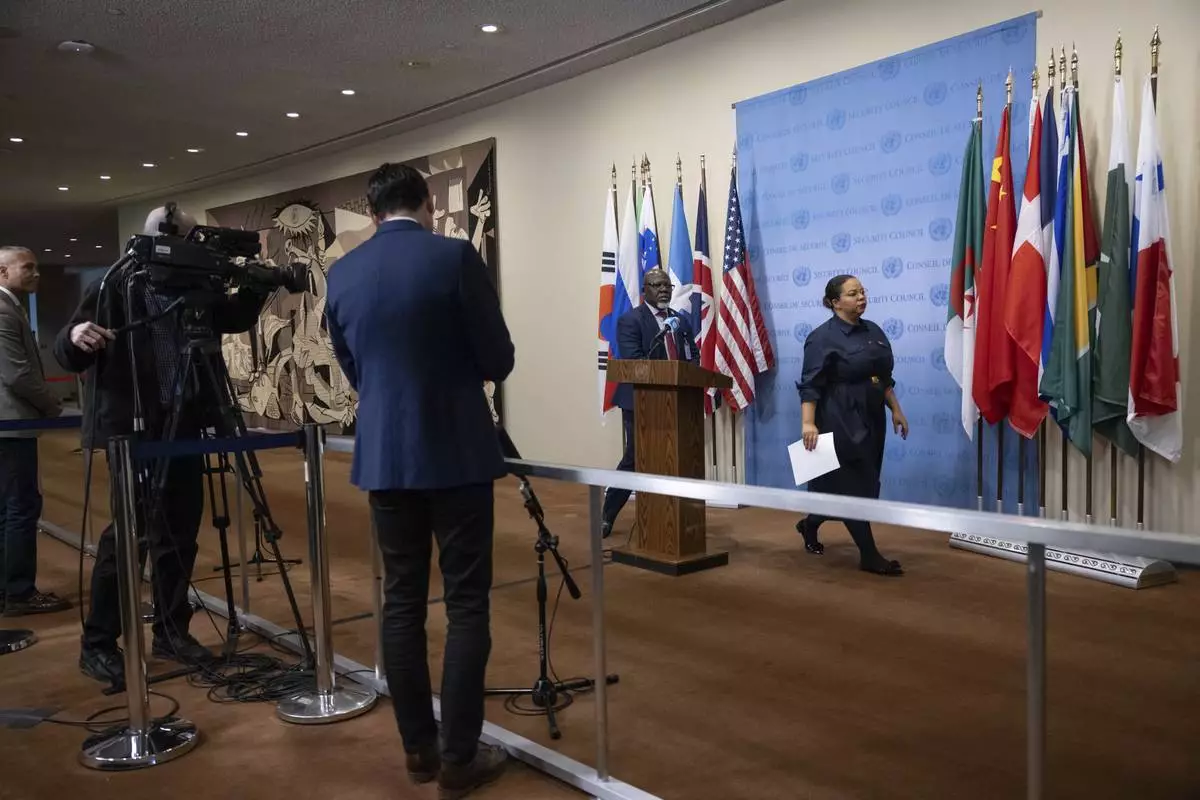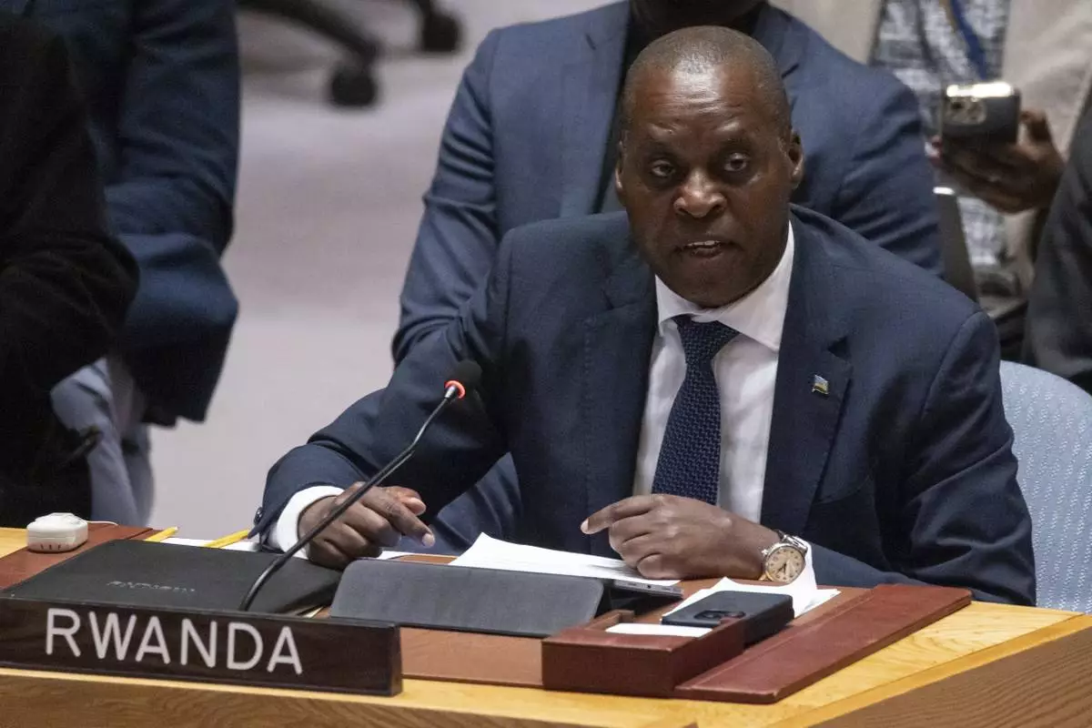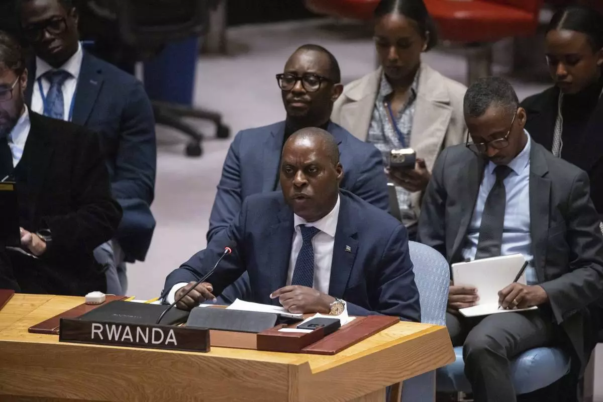 Rwanda's Ambassador and Permanent Representative to the United Nations Ernest Rwamucyo speaks during a Security Council meeting at the United Nations headquarters, Sunday, Jan. 26, 2025. (AP Photo/Yuki Iwamura)
