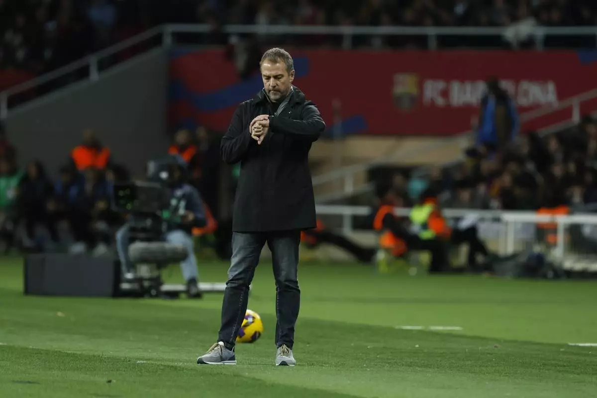 Barcelona's head coach Hansi Flick checks his watches during the Spanish La Liga soccer match between Barcelona and Valencia at the Lluis Companys Olympic Stadium in Barcelona, Spain, Sunday, Jan. 26, 2025. (AP Photo/Joan Monfort)