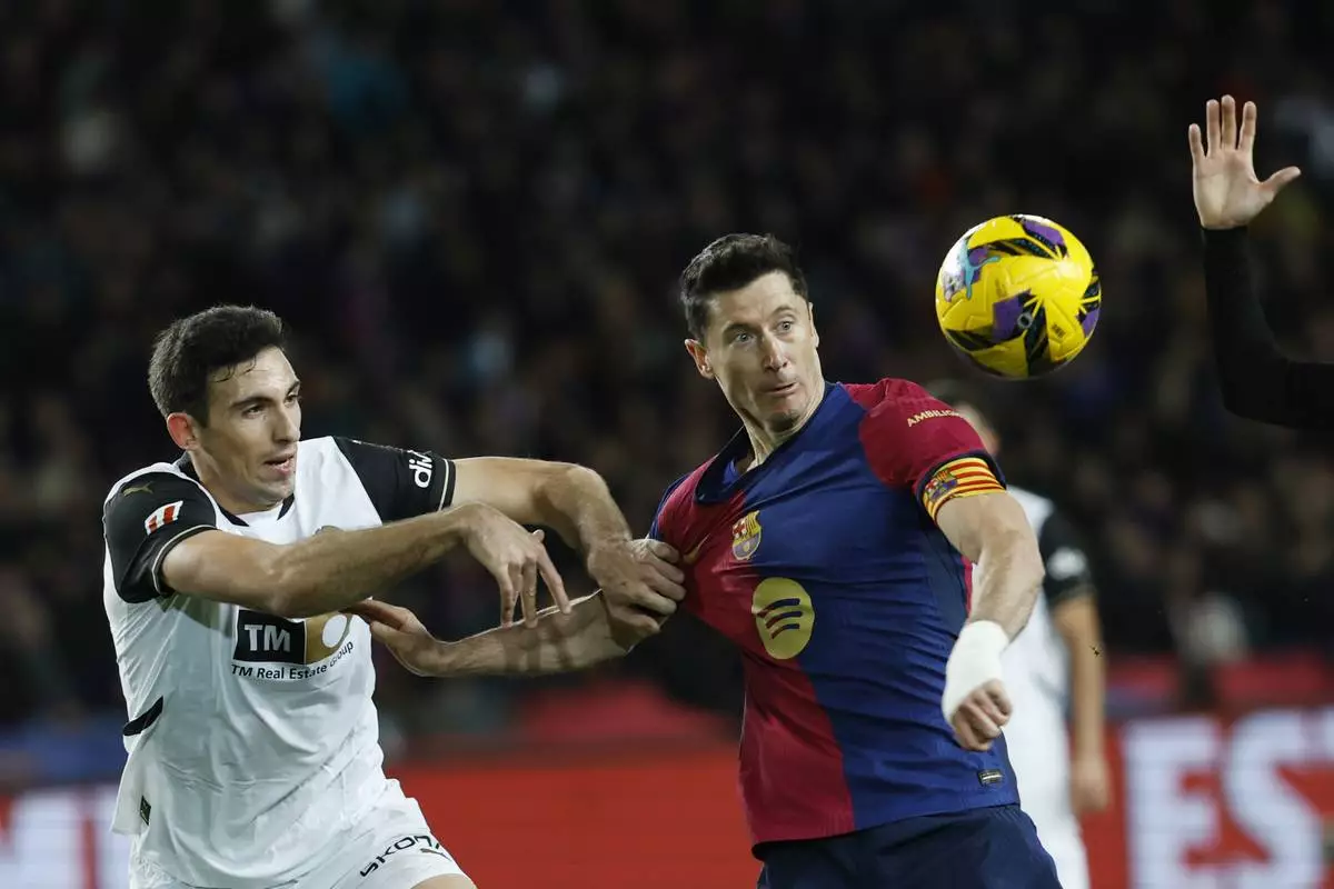 Valencia's Cesar Tarrega, left, and Barcelona's Robert Lewandowski challenge for the ball during the Spanish La Liga soccer match between Barcelona and Valencia at the Lluis Companys Olympic Stadium in Barcelona, Spain, Sunday, Jan. 26, 2025. (AP Photo/Joan Monfort)