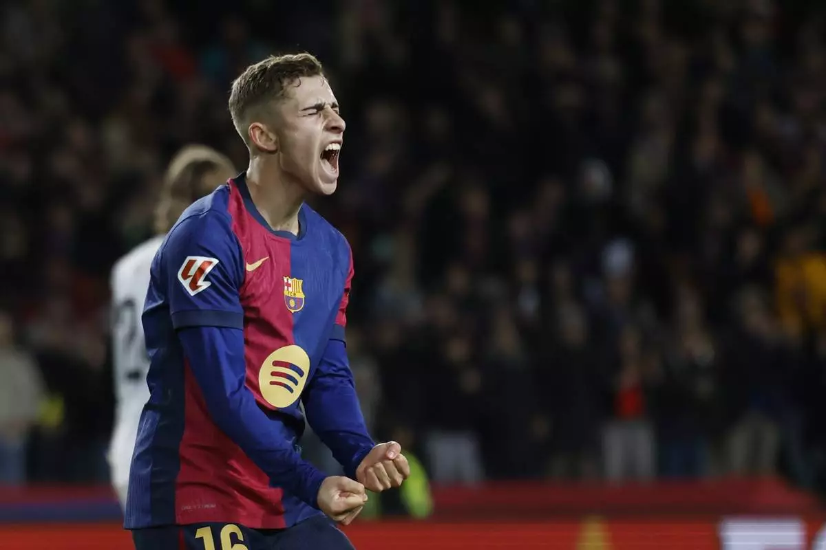 Barcelona's Fermin Lopez celebrates after Robert Lewandowski scored their side's sixth goal during the Spanish La Liga soccer match between Barcelona and Valencia at the Lluis Companys Olympic Stadium in Barcelona, Spain, Sunday, Jan. 26, 2025. (AP Photo/Joan Monfort)
