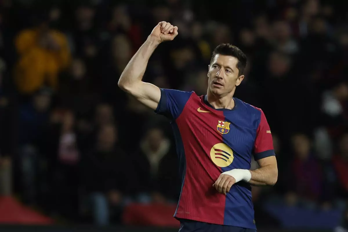 Barcelona's Robert Lewandowski celebrates after scoring his side's sixth goal during the Spanish La Liga soccer match between Barcelona and Valencia at the Lluis Companys Olympic Stadium in Barcelona, Spain, Sunday, Jan. 26, 2025. (AP Photo/Joan Monfort)
