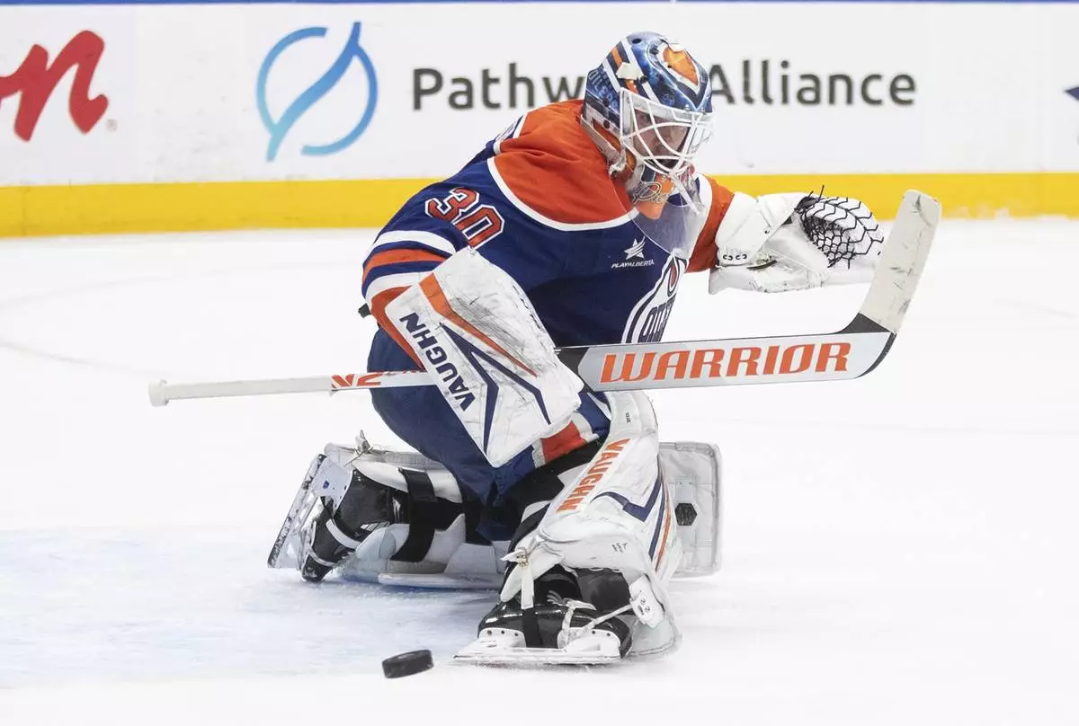 Edmonton Oilers goalie Calvin Pickard (30) makes a save during the third period of an NHL hockey game against the Seattle Kraken in Edmonton, Alberta, Monday, Jan. 27, 2025. (Jason Franson/The Canadian Press via AP)