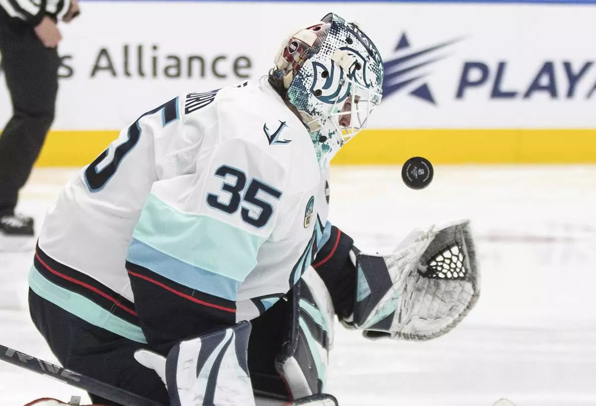 Seattle Kraken goalie Joey Daccord makes a save against the Edmonton Oilers during second-period NHL hockey game action in Edmonton, Alberta, Monday, Jan. 27, 2025. (Jason Franson/The Canadian Press via AP)