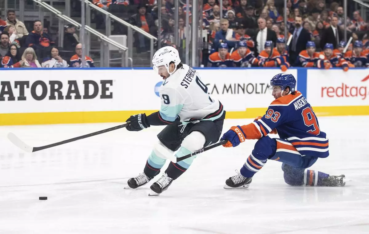 Seattle Kraken's Chandler Stephenson (9) breaks away from Edmonton Oilers' Ryan Nugent-Hopkins (93) during first-period NHL hockey game action in Edmonton, Alberta, Monday, Jan. 27, 2025. (Jason Franson/The Canadian Press via AP)