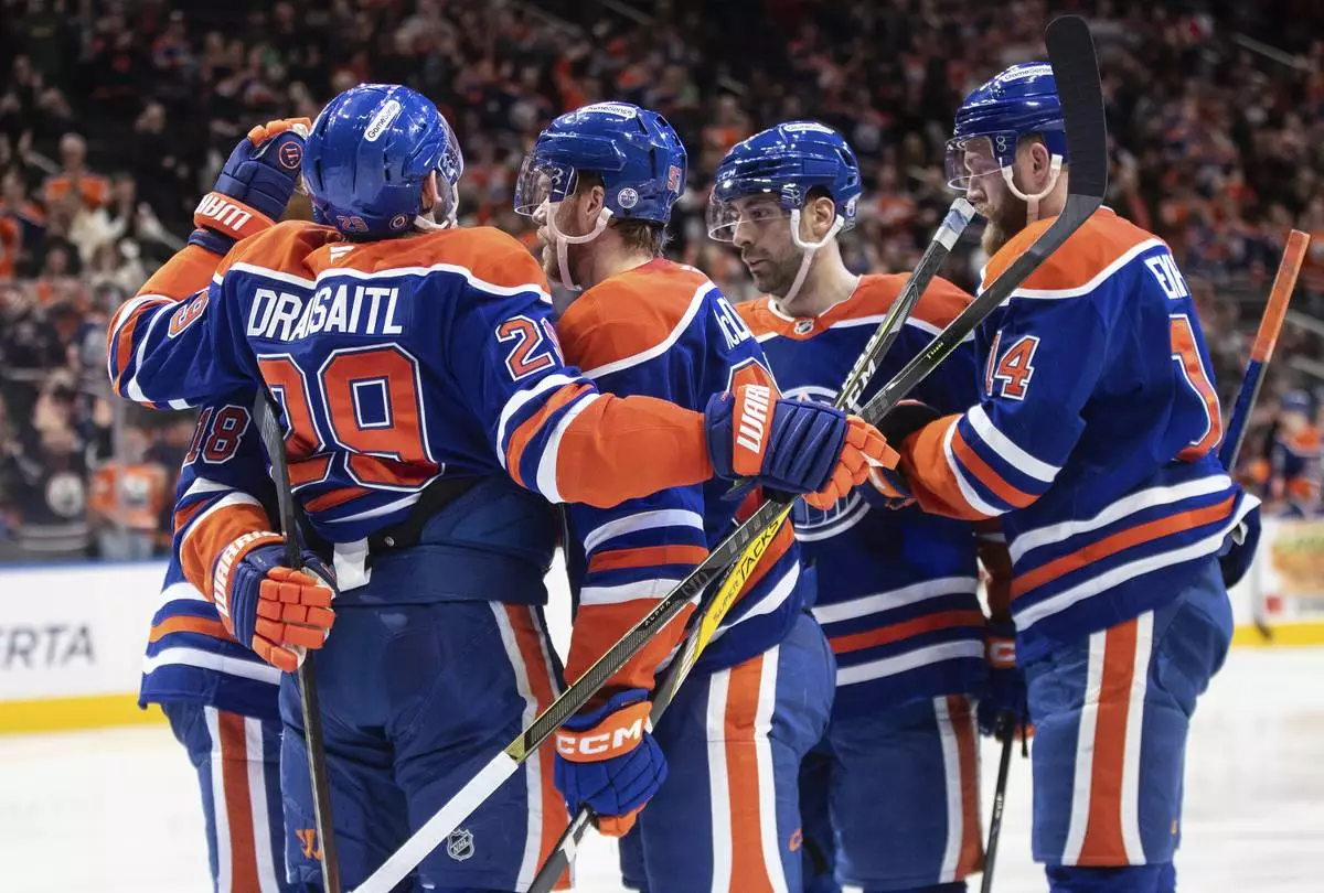 From left to right, Edmonton Oilers' Zach Hyman, Leon Draisaitl, Connor McDavid, Evan Bouchard and Mattias Ekholm celebrate after a goal against the Seattle Kraken during second-period NHL hockey game action in Edmonton, Alberta, Monday, Jan. 27, 2025. (Jason Franson/The Canadian Press via AP)