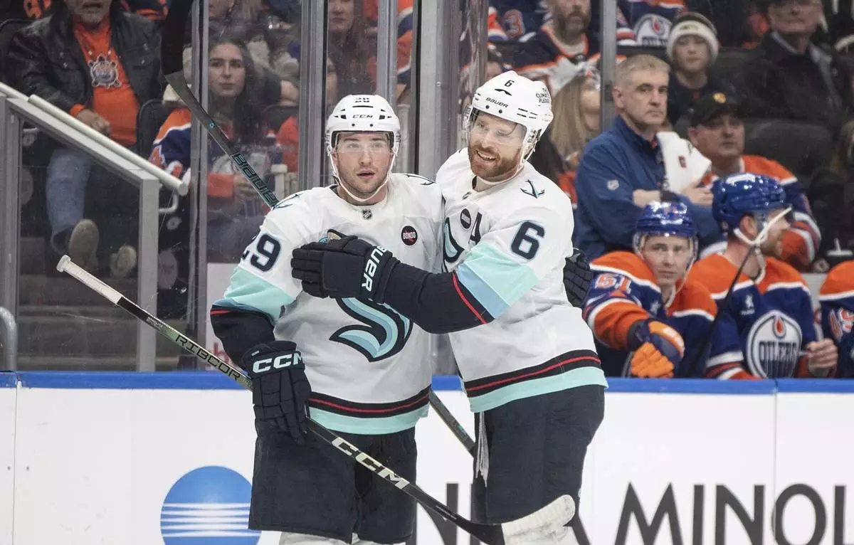 Seattle Kraken's Vince Dunn (29) celebrates after his goal with teammate Adam Larsson (6) during first-period NHL hockey game action against the Edmonton Oilers in Edmonton, Alberta, Monday, Jan. 27, 2025. (Jason Franson/The Canadian Press via AP)