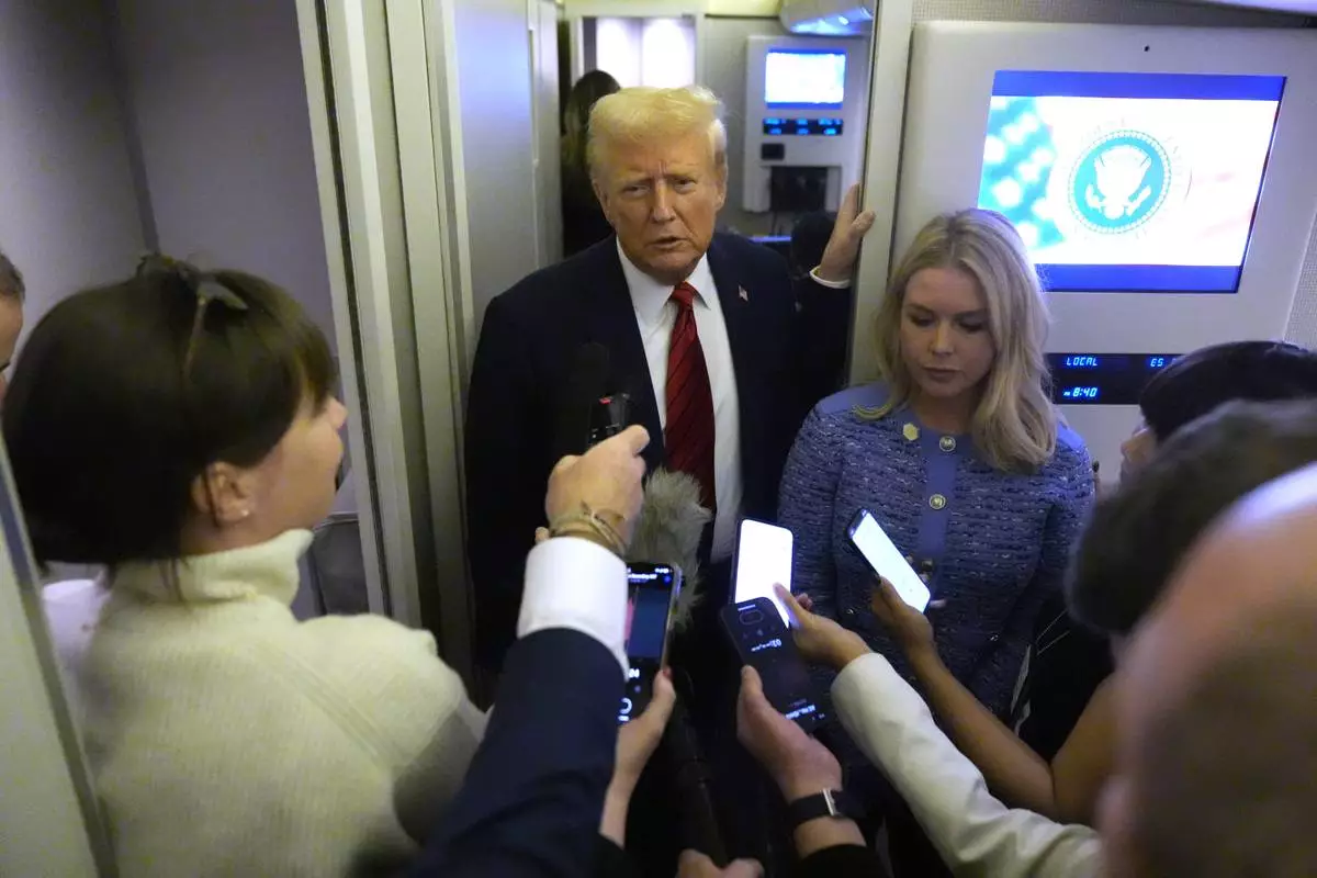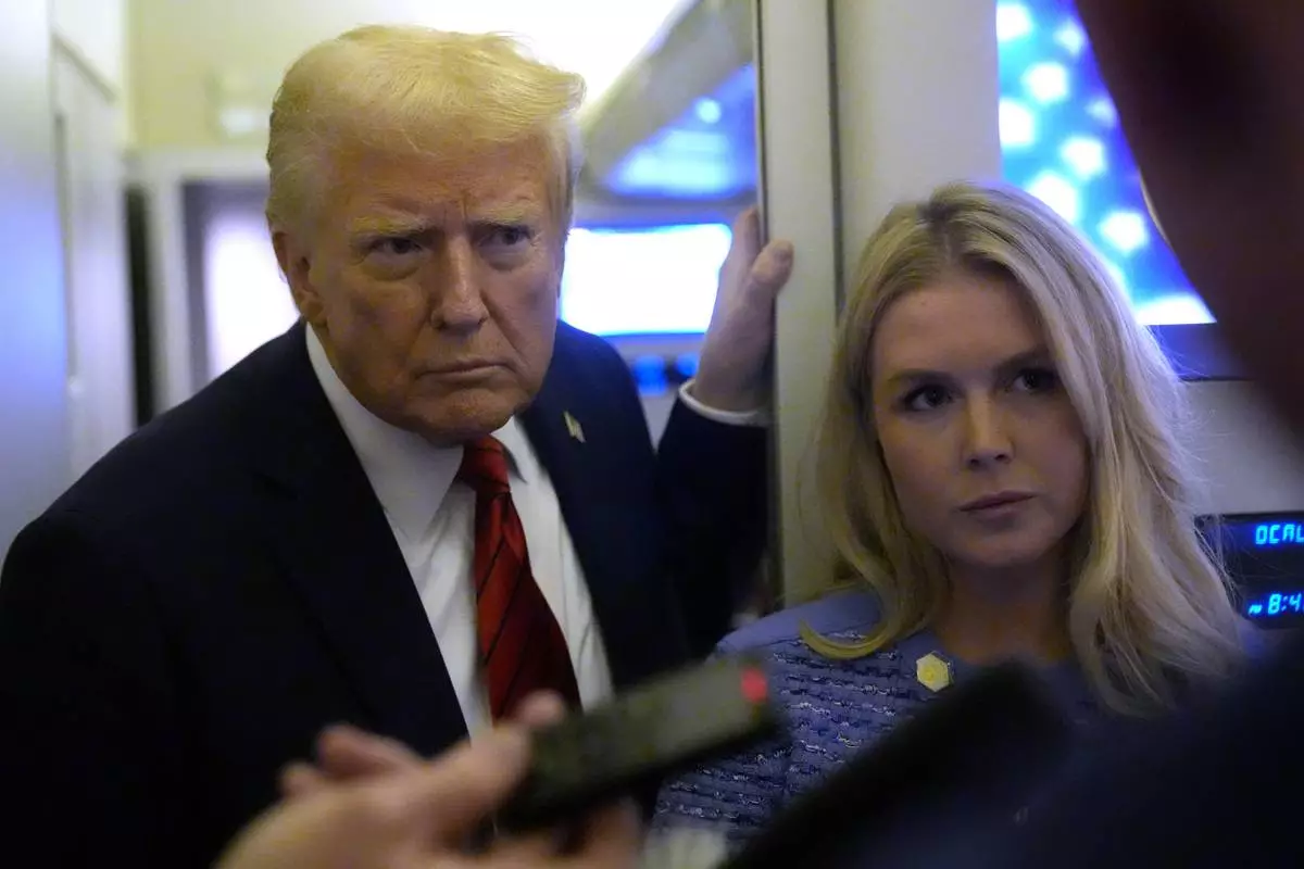 FILE - President Donald Trump speaks to reporters aboard Air Force One en route from Miami to Joint Base Andrews, Md., Jan. 27, 2025, as White House press secretary Karoline Leavitt listens. (AP Photo/Mark Schiefelbein, File)