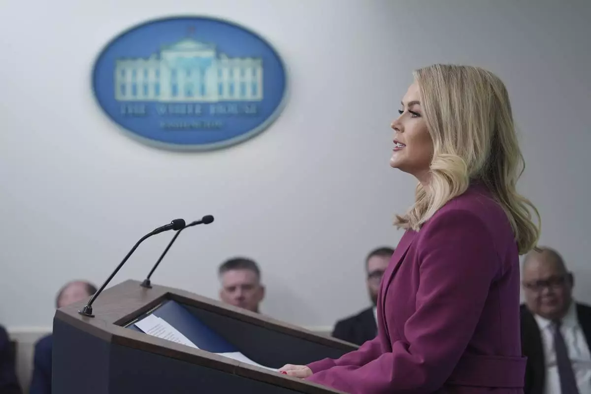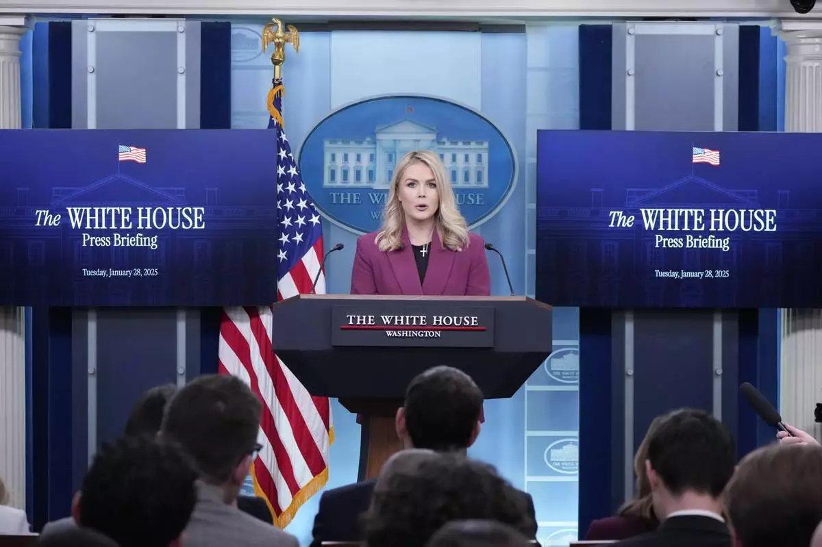 White House press secretary Karoline Leavitt speaks with reporters in the James Brady Press Briefing Room at the White House, Tuesday, Jan. 28, 2025, in Washington. (AP Photo/Alex Brandon)