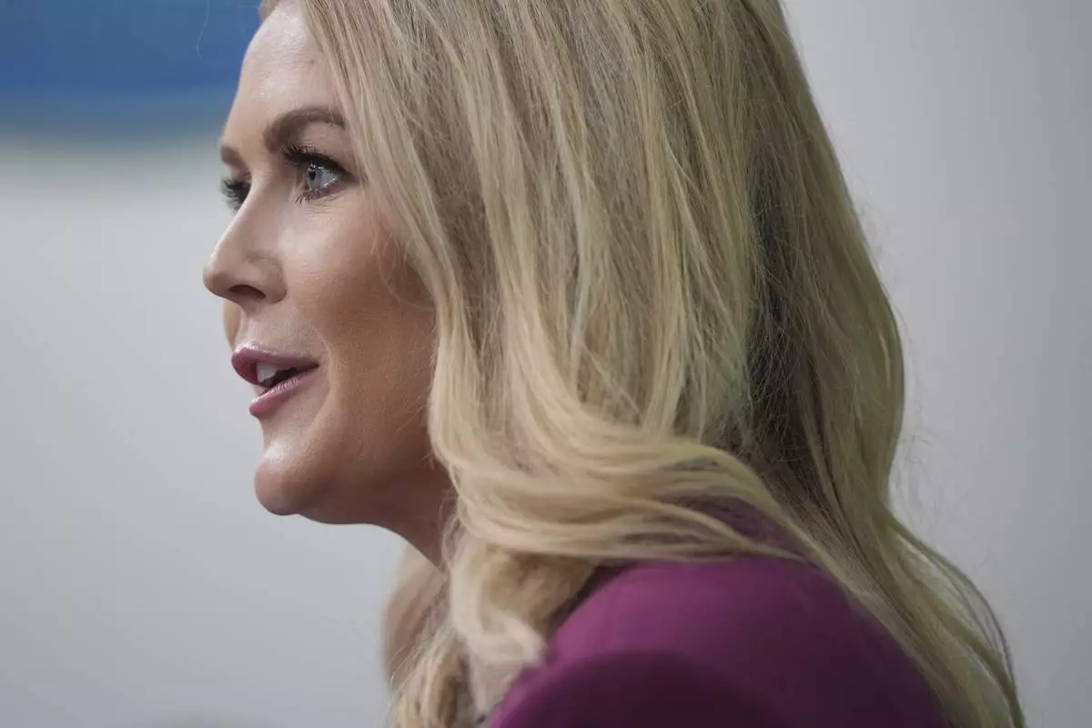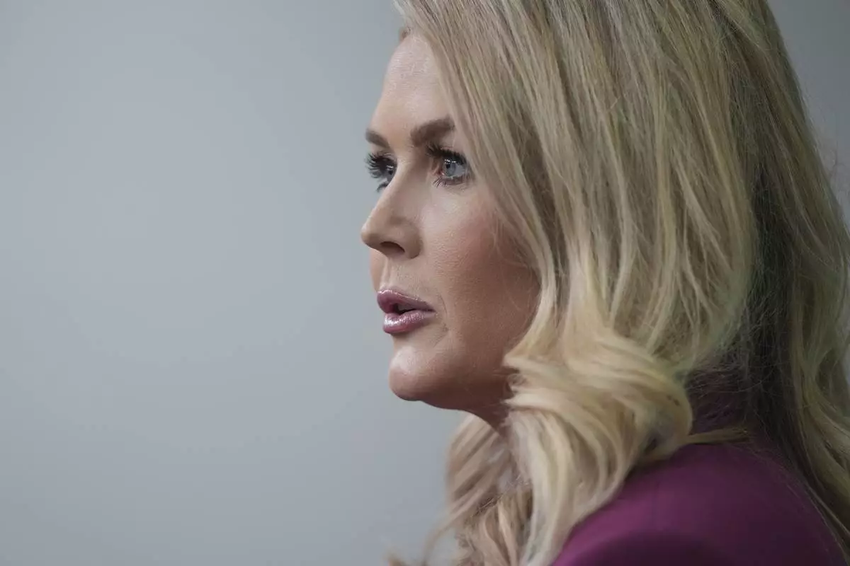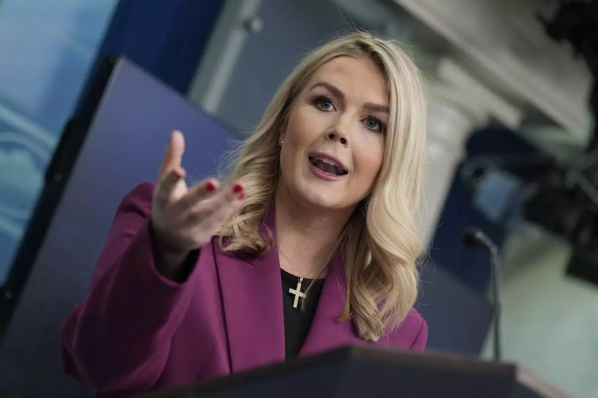 FILE - White House press secretary Karoline Leavitt speaks with reporters at the White House, Jan. 22, 2025, in Washington. (AP Photo/Alex Brandon, File)