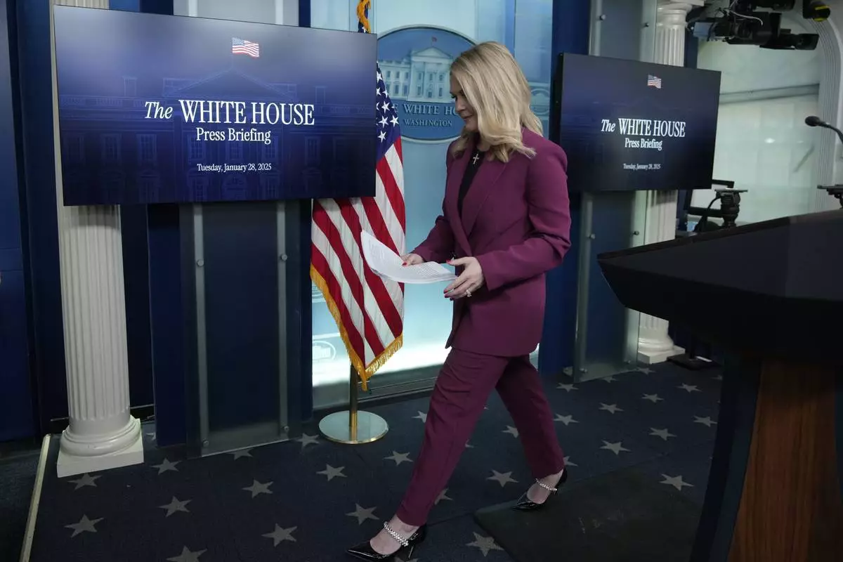 White House press secretary Karoline Leavitt walks off after speaking at the daily briefing at the White House in Washington Tuesday, Jan. 28, 2025. (AP Photo/Ben Curtis)