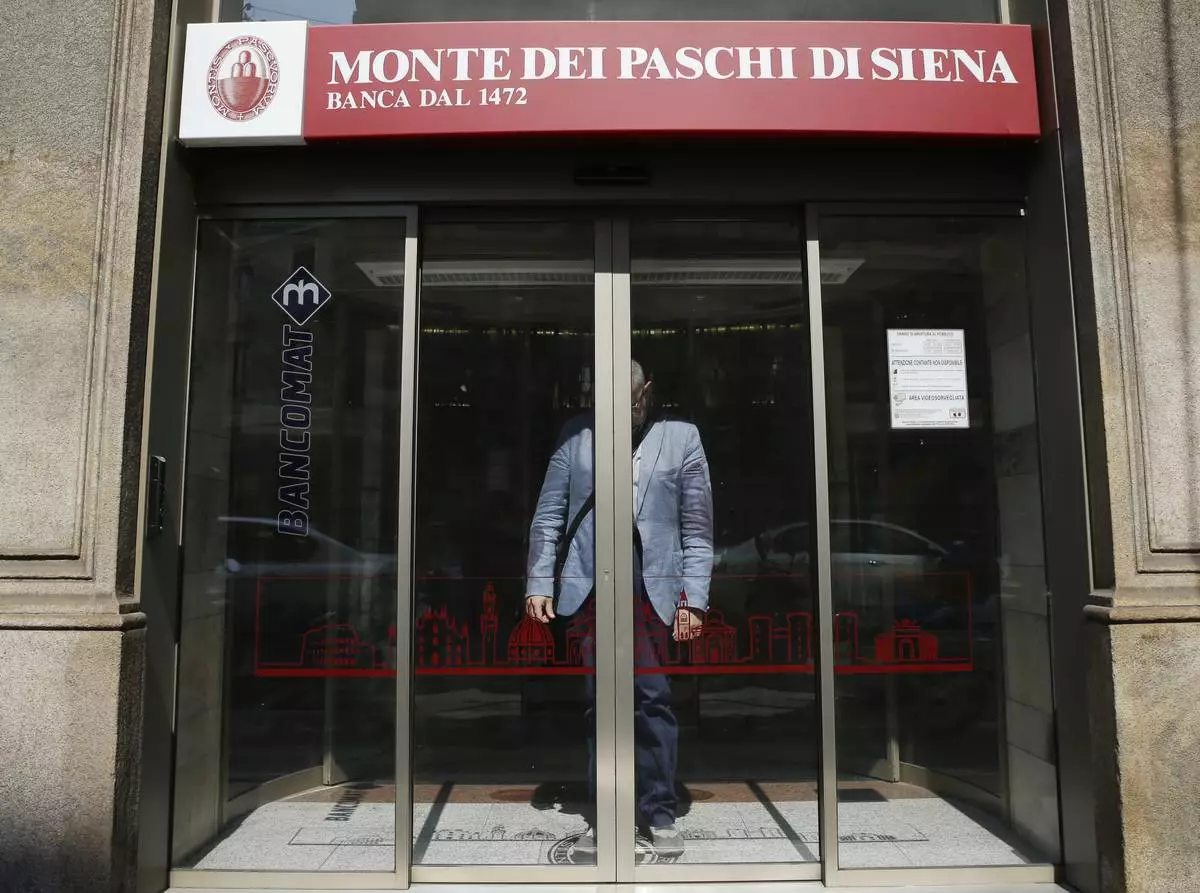 FILE - A man waits for the sliding doors to open to exit a Monte dei Paschi di Siena bank branch, in Milan, Italy, on July 5, 2017. (AP Photo/Luca Bruno, File)