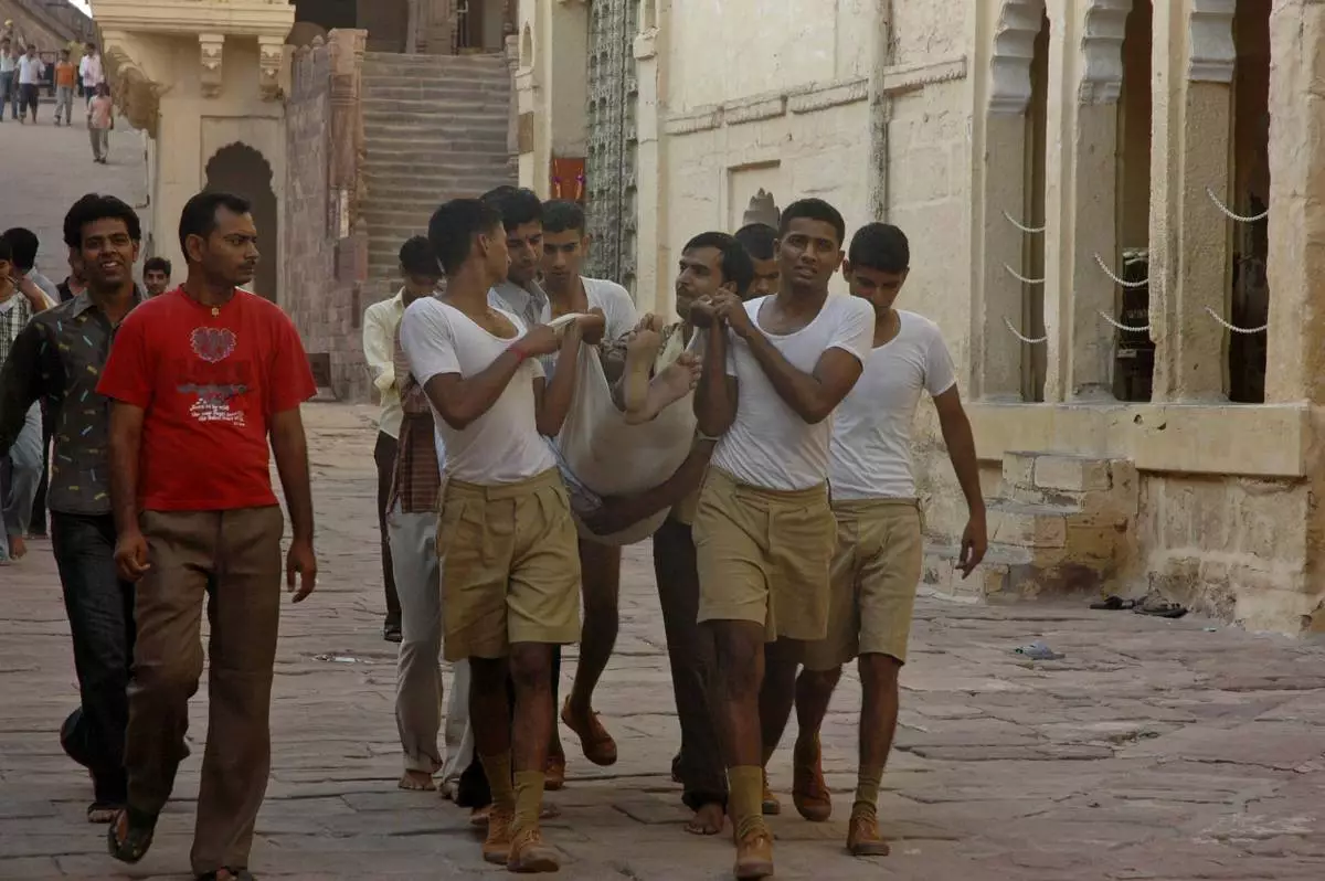 FILE - Volunteers carry a stampede victim in Jodhpur, India, Tuesday, Sept. 30, 2008. (AP Photo, File)