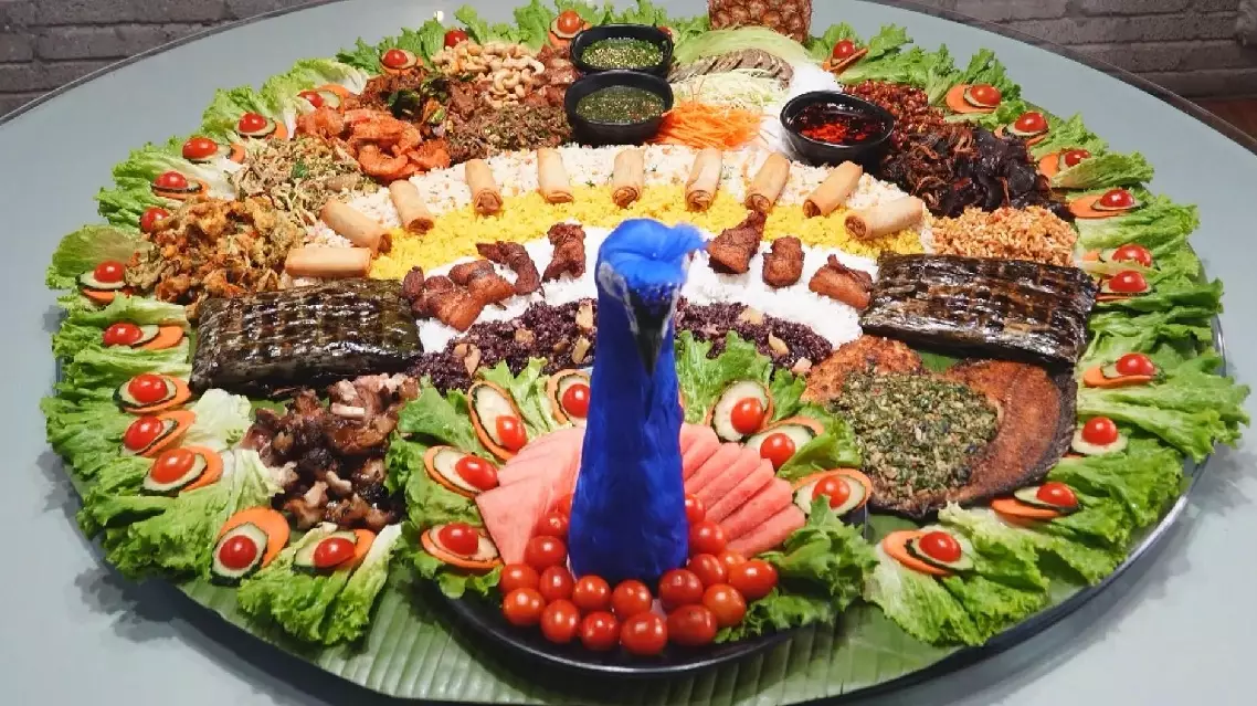 The eye-catching culinary spectacle brings together iconic dishes from the region's diverse ethnic groups which are artfully arranged on banana leaves, mimicking the majestic display of a peacock's plumage.