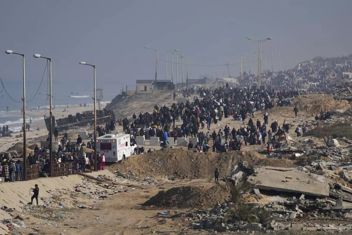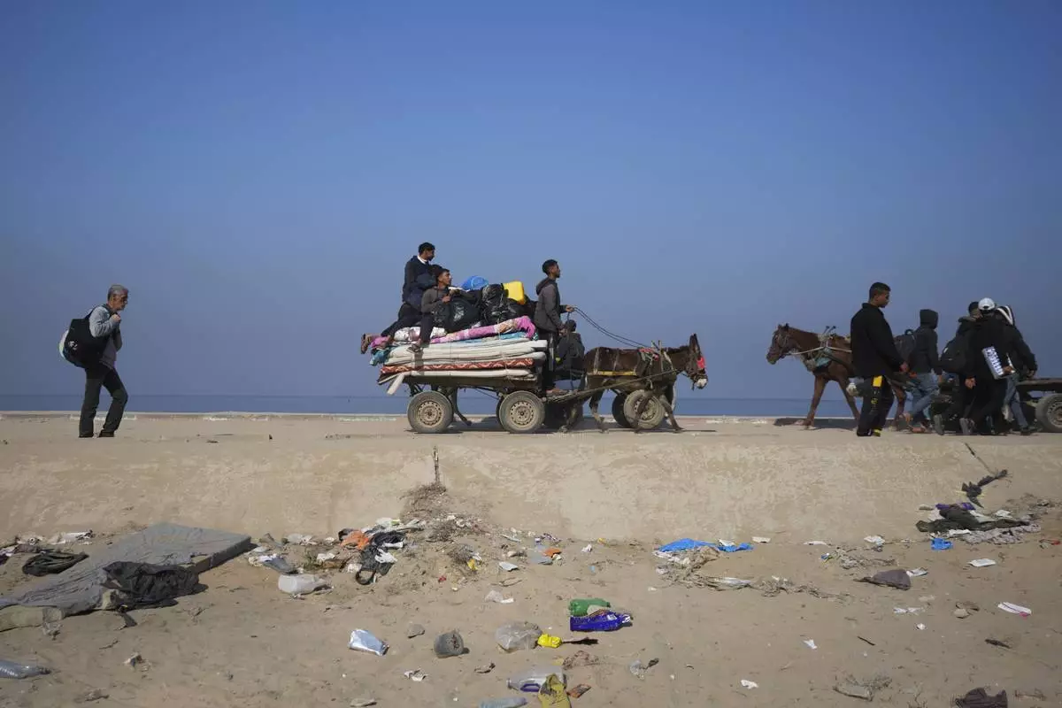 Displaced Palestinians arrive to Beit Lahia, northern Gaza Strip, Wednesday, Jan. 29, 2025, after Israel began allowing hundreds of thousands of Palestinians to return to the heavily damaged area last Monday. (AP Photo/Jehad Alshrafi)