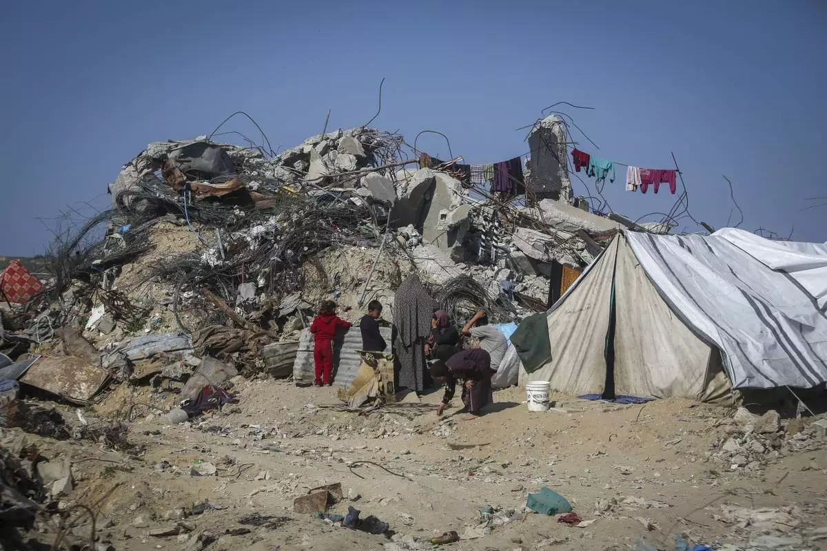 Palestinians stand next to tents surrounded by buildings that were destroyed by the Israeli air and ground offensive are seen at the Tel al-Hawa neighbourhood in Gaza Strip, Tuesday, Jan. 28, 2025. (AP Photo/Mohamamd Abu Samra)