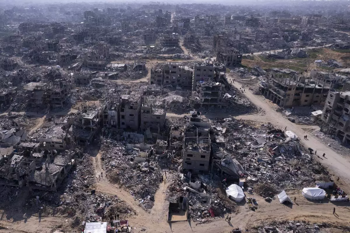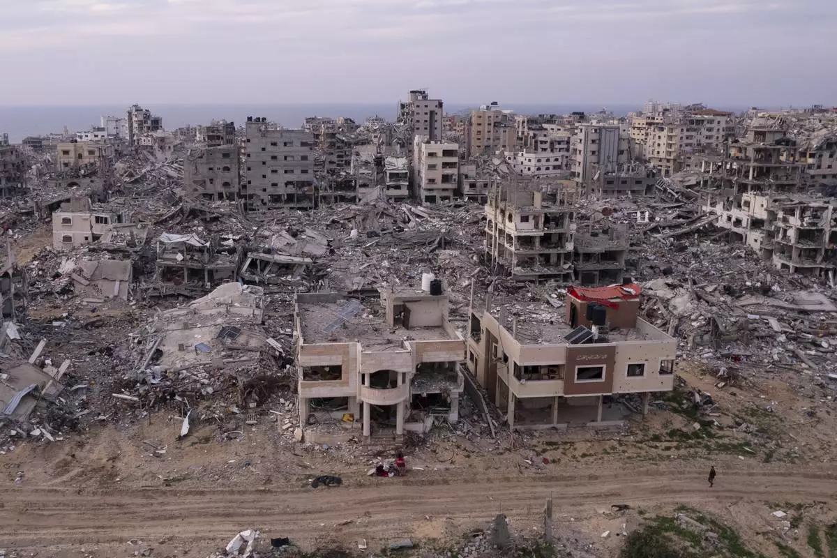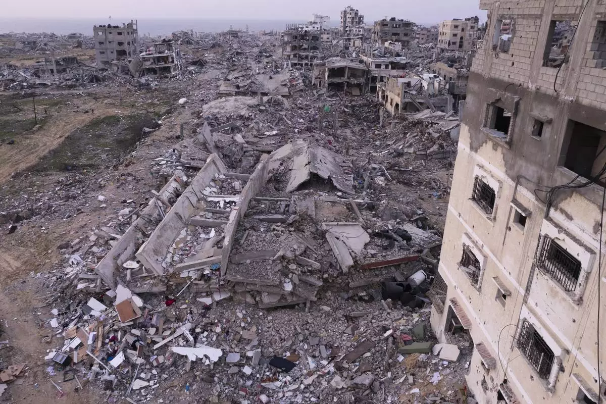 Buildings that were destroyed by the Israeli air and ground offensive are seen at the Tel al-Hawa neighbourhood in Gaza Strip, Tuesday, Jan. 28, 2025. (AP Photo/Mohamamd Abu Samra)