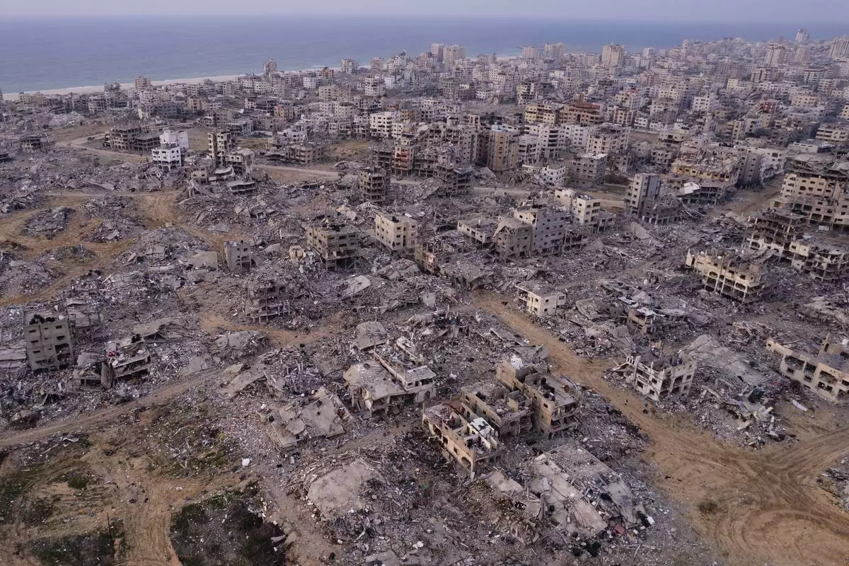 An aerial photograph taken by a drone shows the destruction caused by the Israeli air and ground offensive in Jabaliya, Gaza Strip, Wednesday, Jan. 29, 2025. (AP Photo/Mohammad Abu Samra)