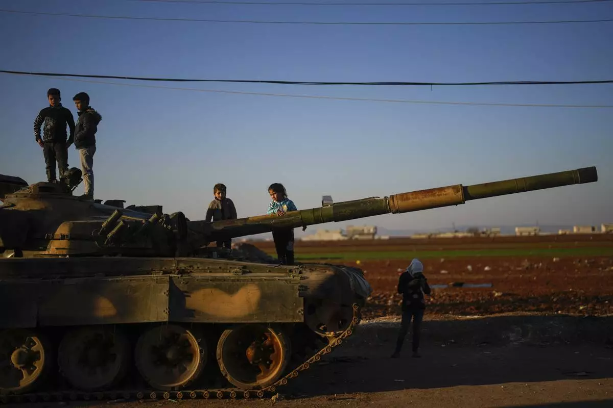 Children on the top of an ousted Syrian government forces tank that was left on a street in the town of Marea on the outskirts of Aleppo city, Syria, Tuesday, Jan. 28, 2025. (AP Photo/Khalil Hamra)