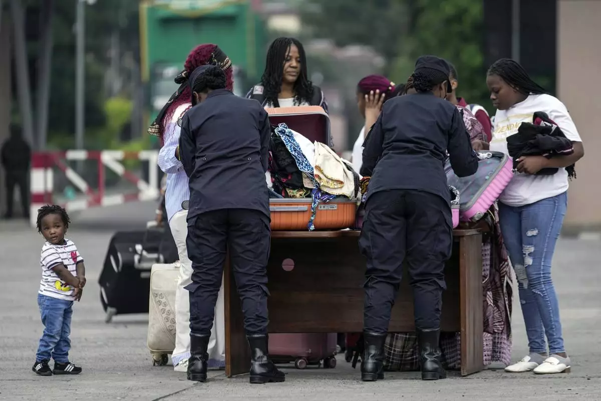 A child pushes a suitcase towards Rwanda security officials checking people crossing from Congo in Gisenyi, Rwanda, Wednesday, Jan. 29, 2025, following M23 rebels' advances into eastern Congo's capital Goma. (AP Photo/Brian Inganga)