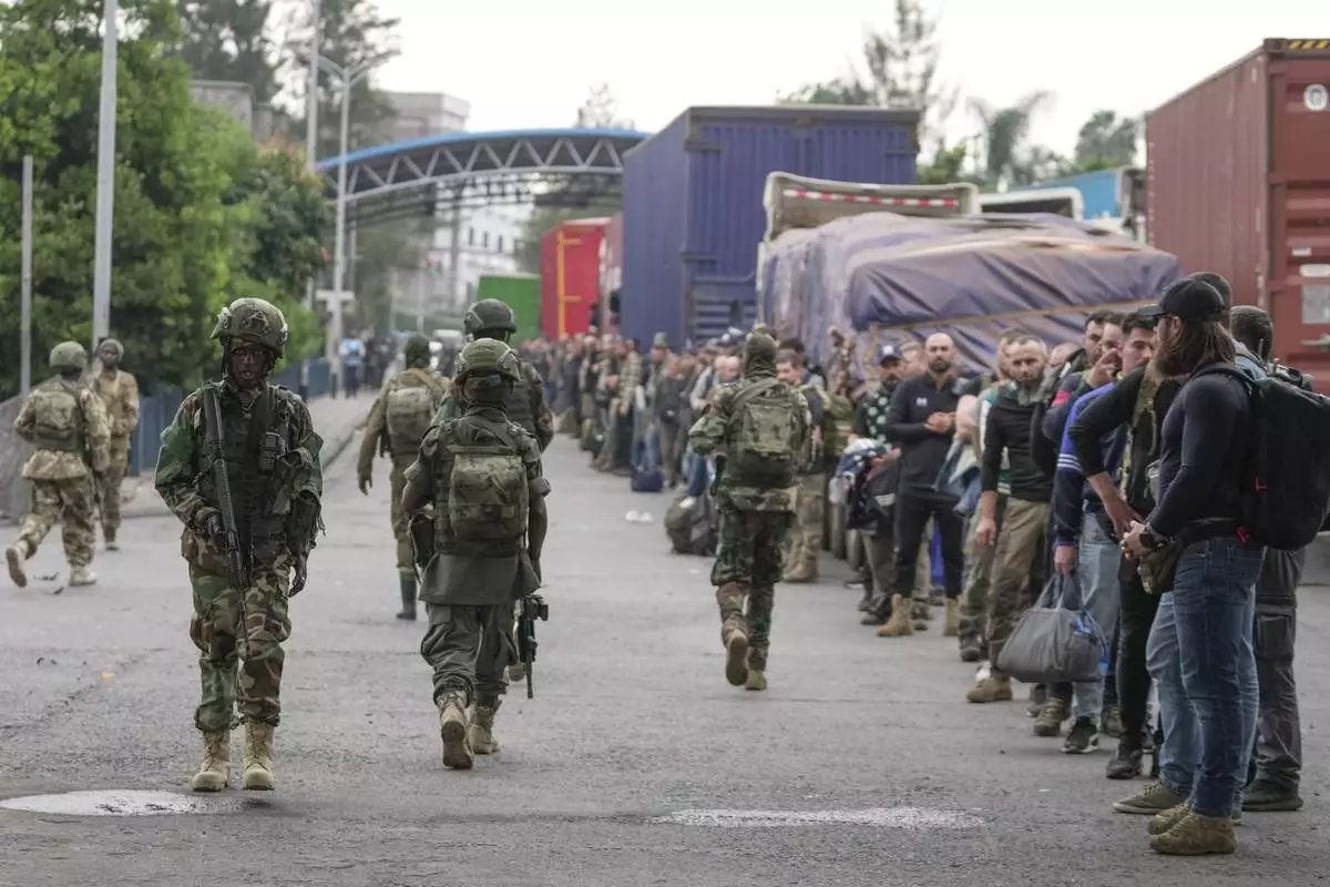 M23 rebels escort Romanian mercenaries past UN peacekeepers to the border crossing into Rwanda in Goma, Democratic Republic of Congo, Wednesday, Jan. 29, 2025.(AP Photo/Moses Sawasawa)
